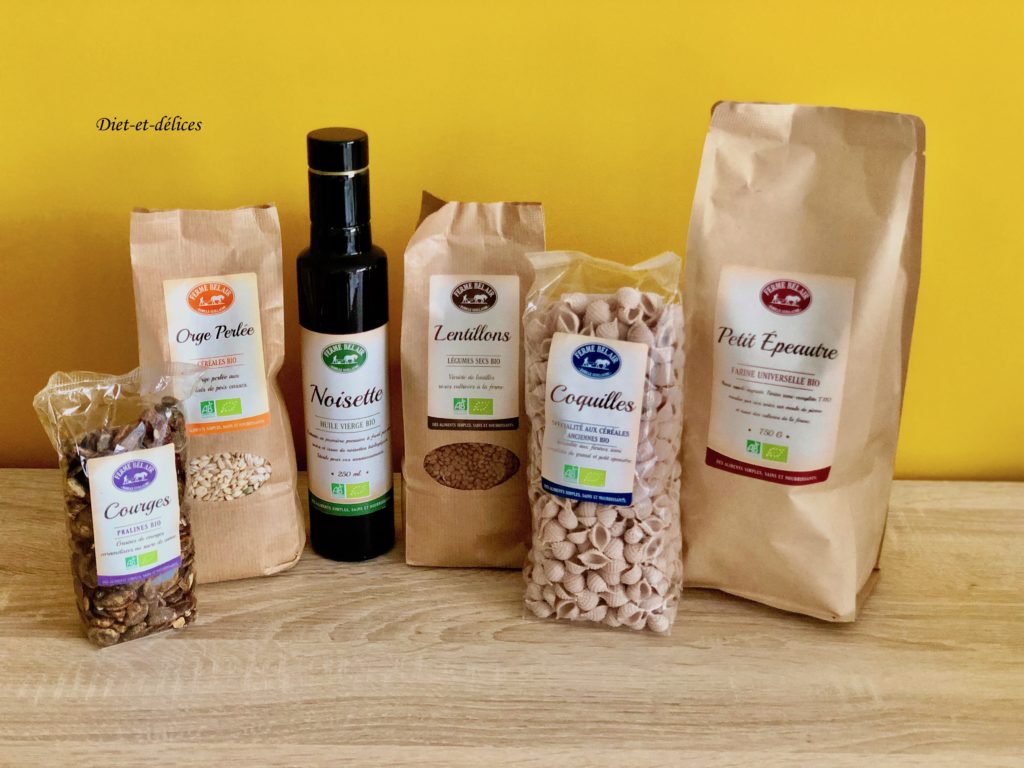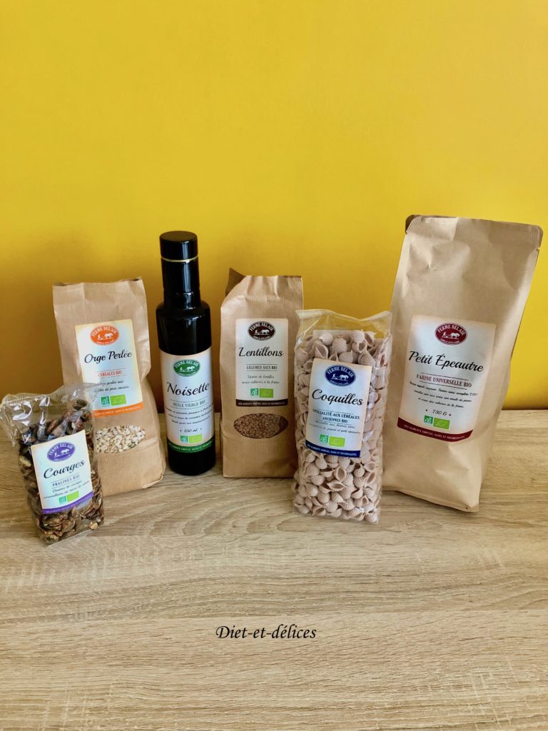 - – des farines sur meule : des variétés de céréales anciennes en agriculture biologique sont notamment transformées en farines. Plus robustes, ces céréales fournissent des farines de meilleure qualité. Des farines de légumineuses (pois, lentillons) et de fruits (noisette) sont également élaborées. Le moulin (Astrié) à meule en granit du Tarn écrase les grains lentement sans échauffement. Ainsi, toutes les qualités nutritionnelles sont préservées. La farine est ensuite tamisée pour séparer l’enveloppe du grain (le son).