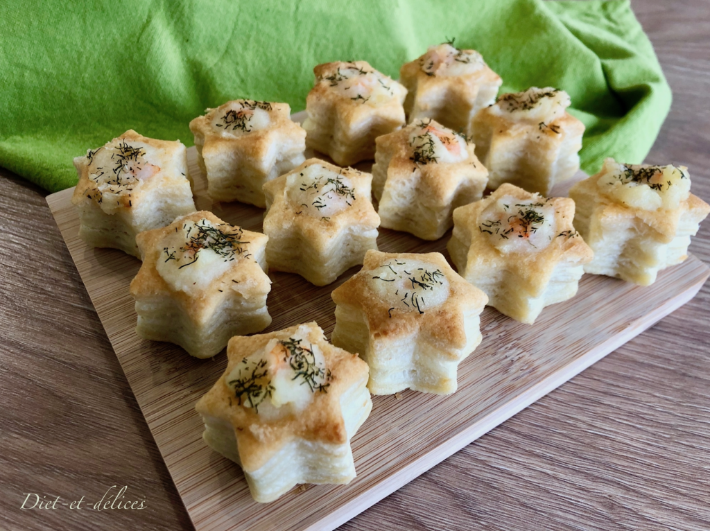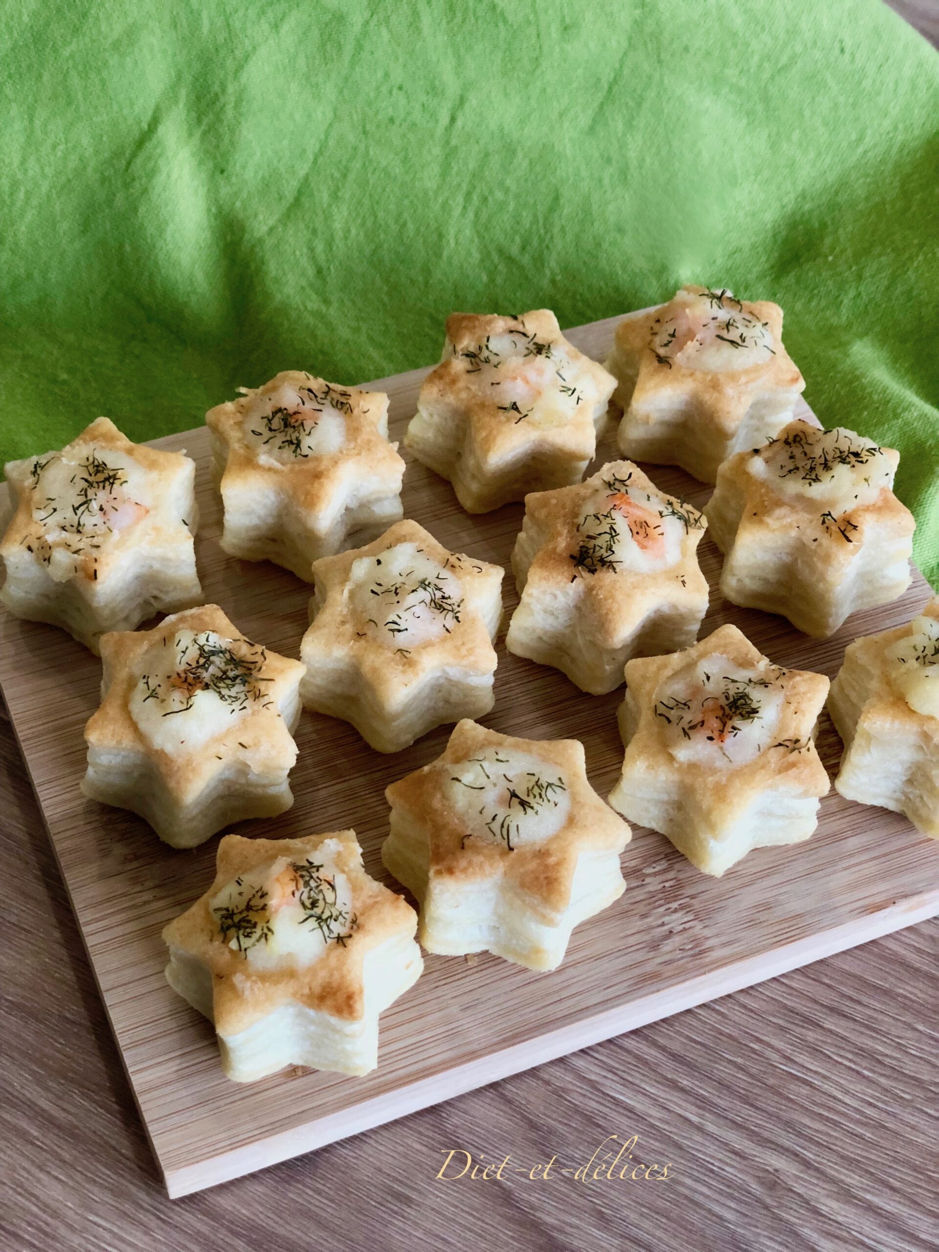 - Répartir la sauce citronnée aux crevettes dans les bouchées étoile.