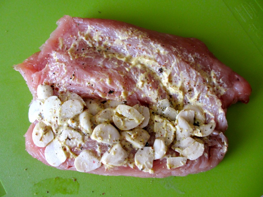 - Répartir une cuillère à café de moutarde à l’ancienne dans chaque filet.
