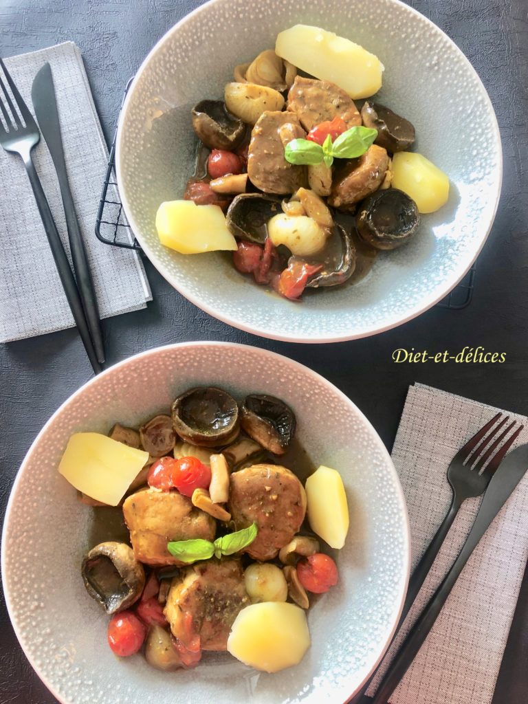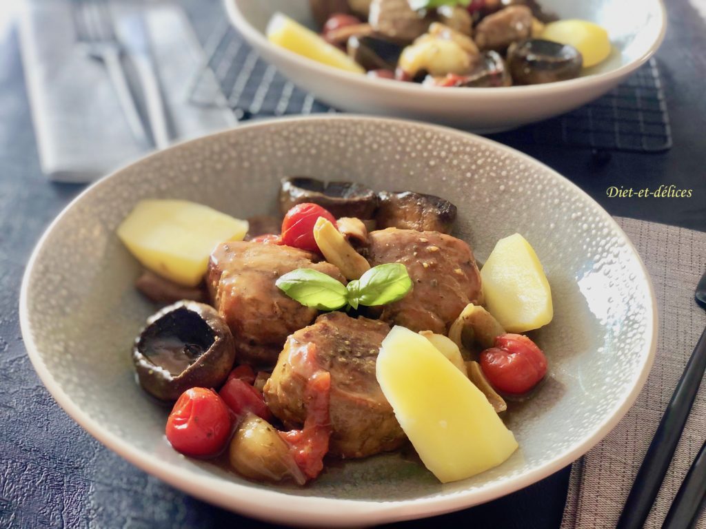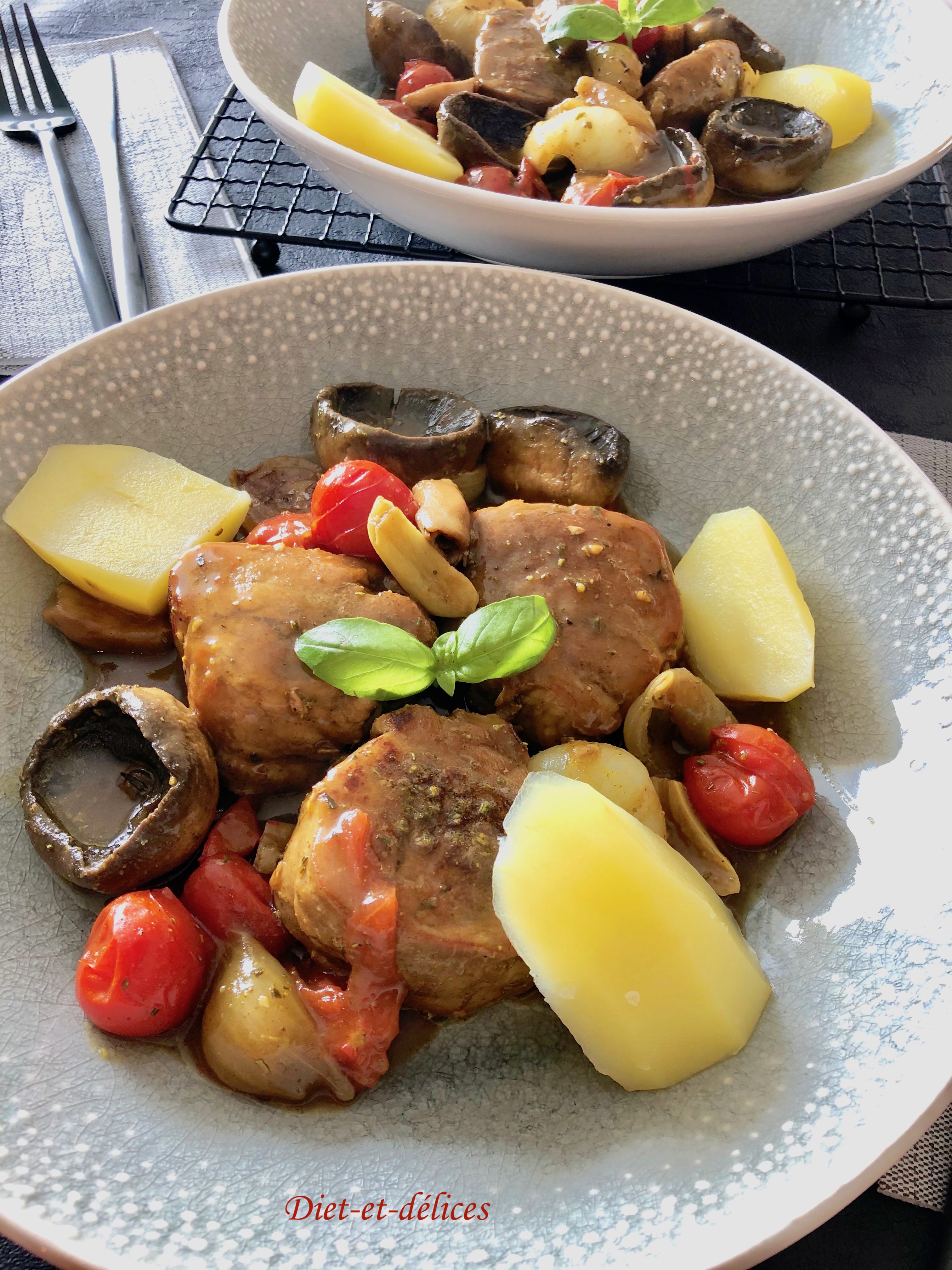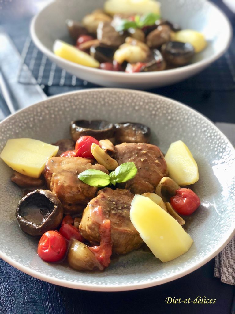 filet mignon, porc, tomates cerises, champignons, curcuma, épices