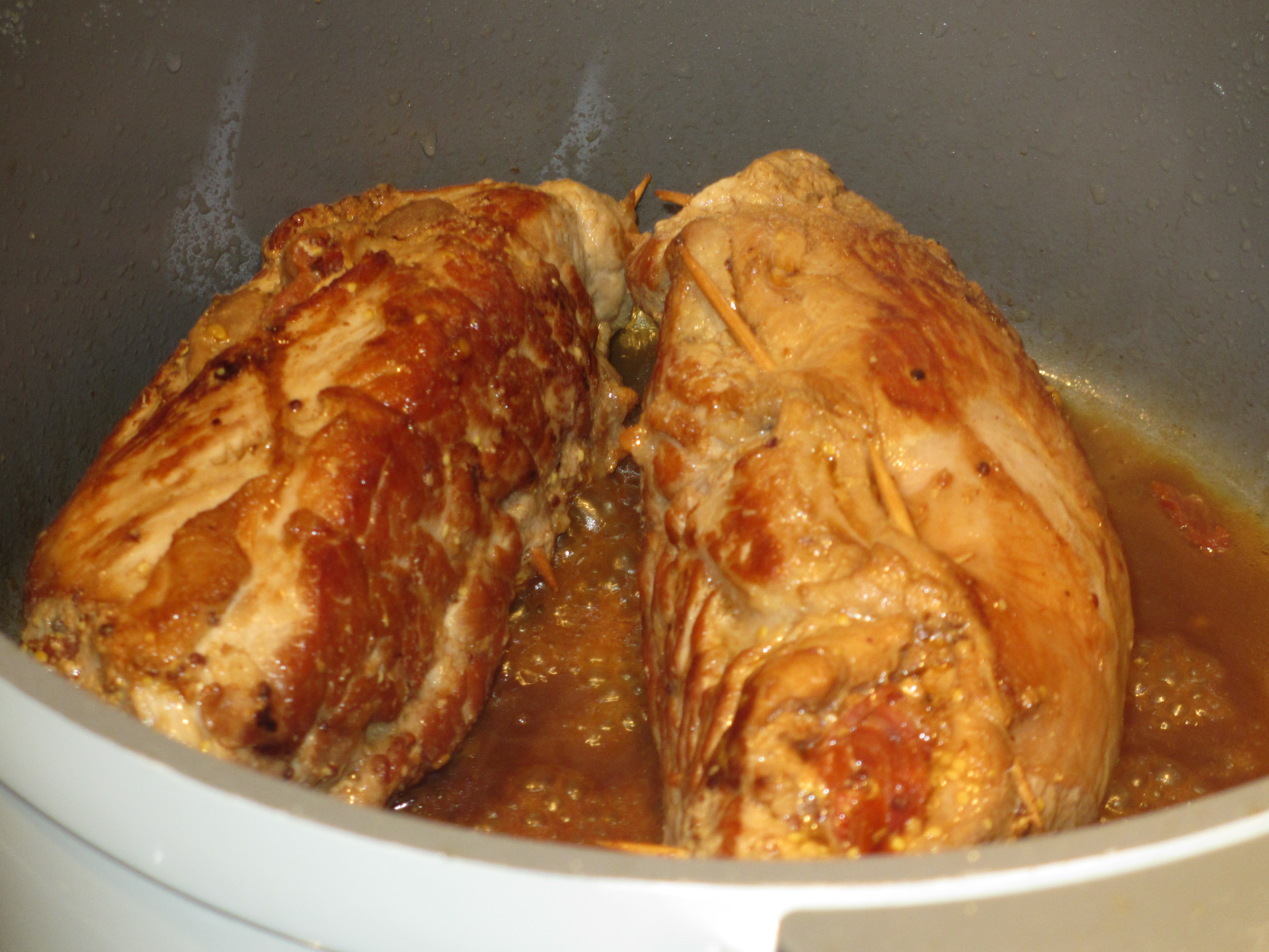 - Dans une poêle bien chaude, faire rôtir et colorer le filet mignon lardé.