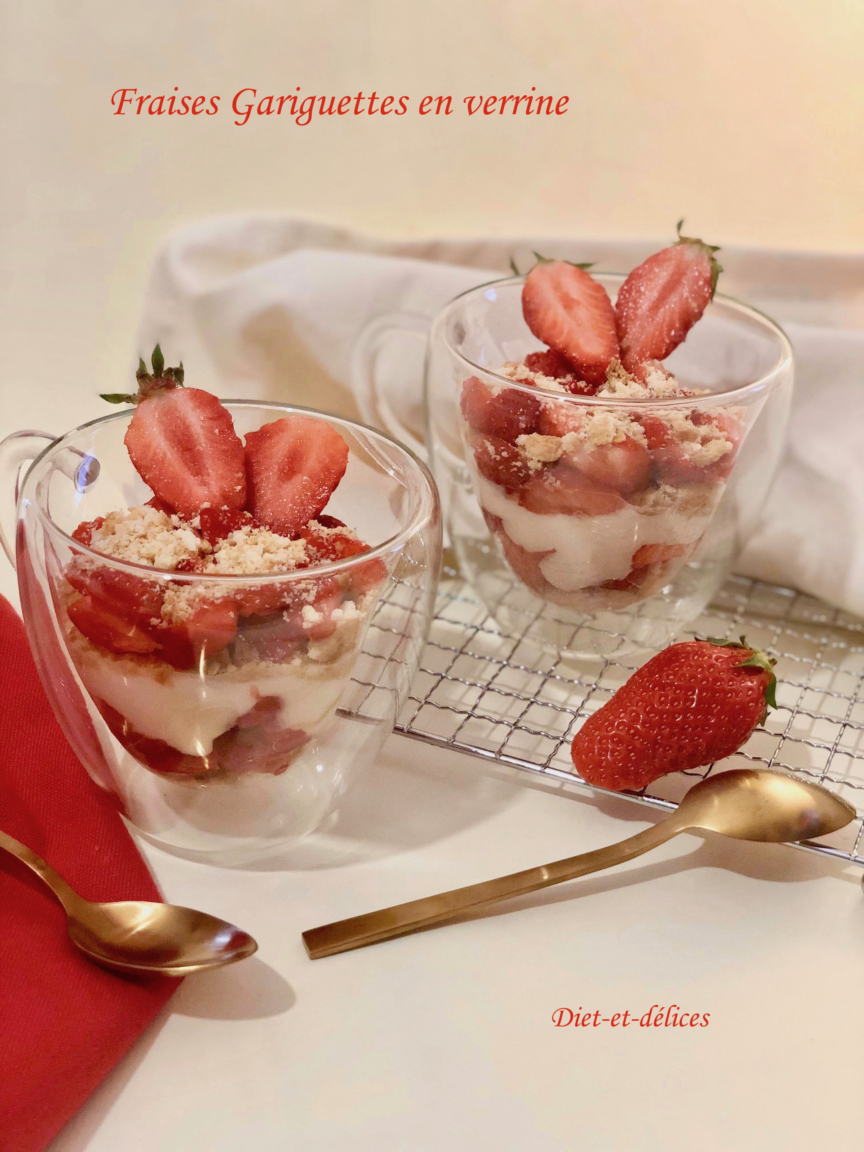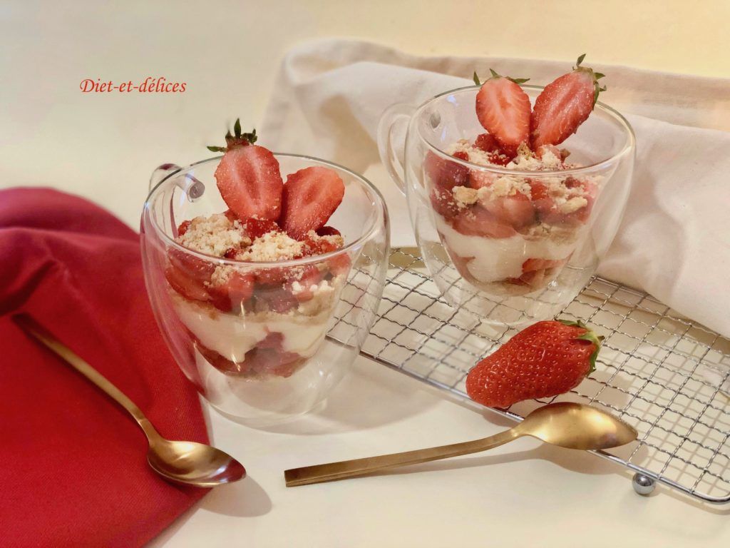 - Décorer chaque verrines avec une fraise coupée en deux et une demie galette bretonne émiettée.