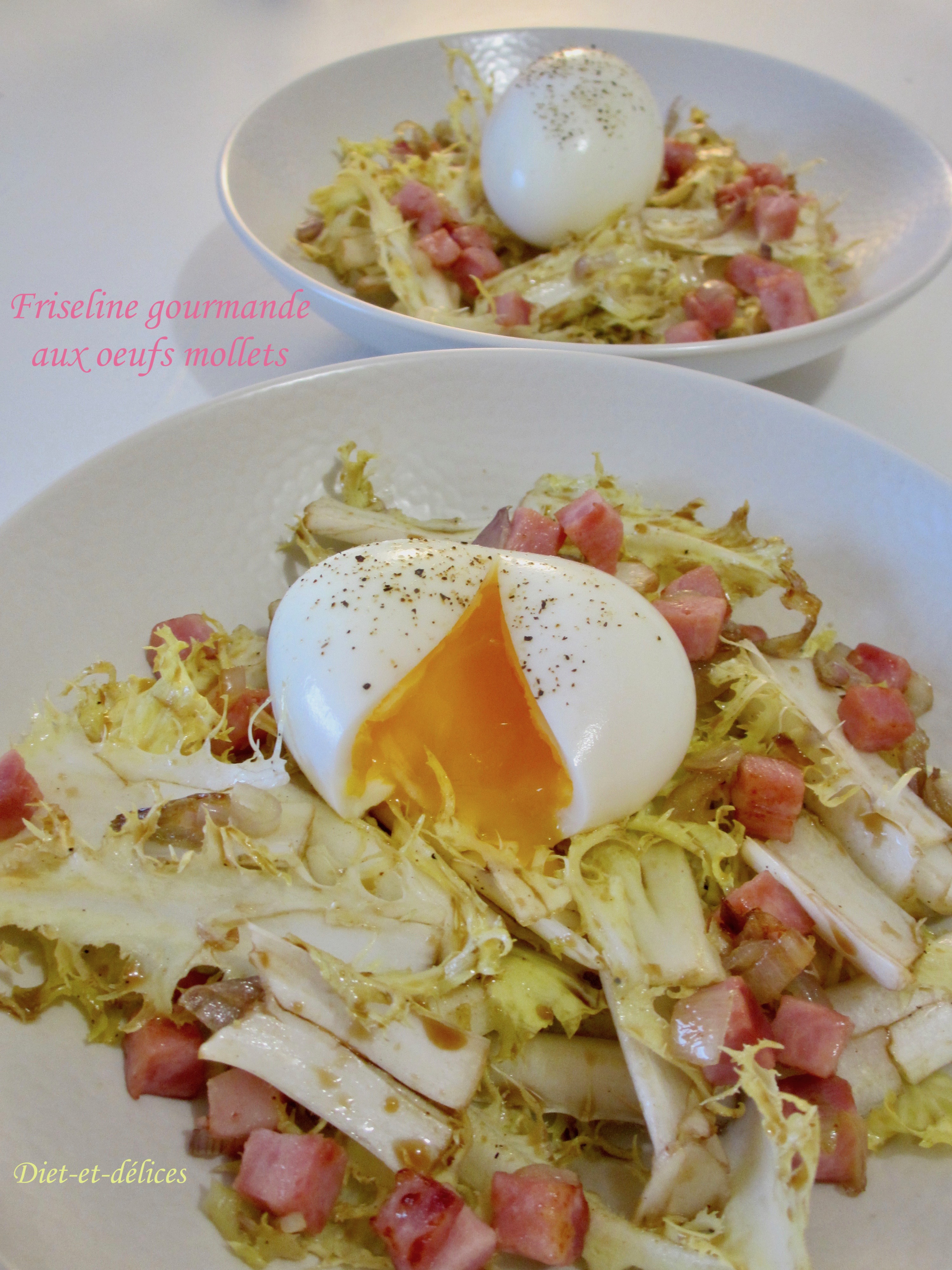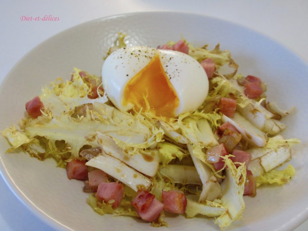 salade, friseline, oeuf, dés de jambon, échalote, oeuf mollet