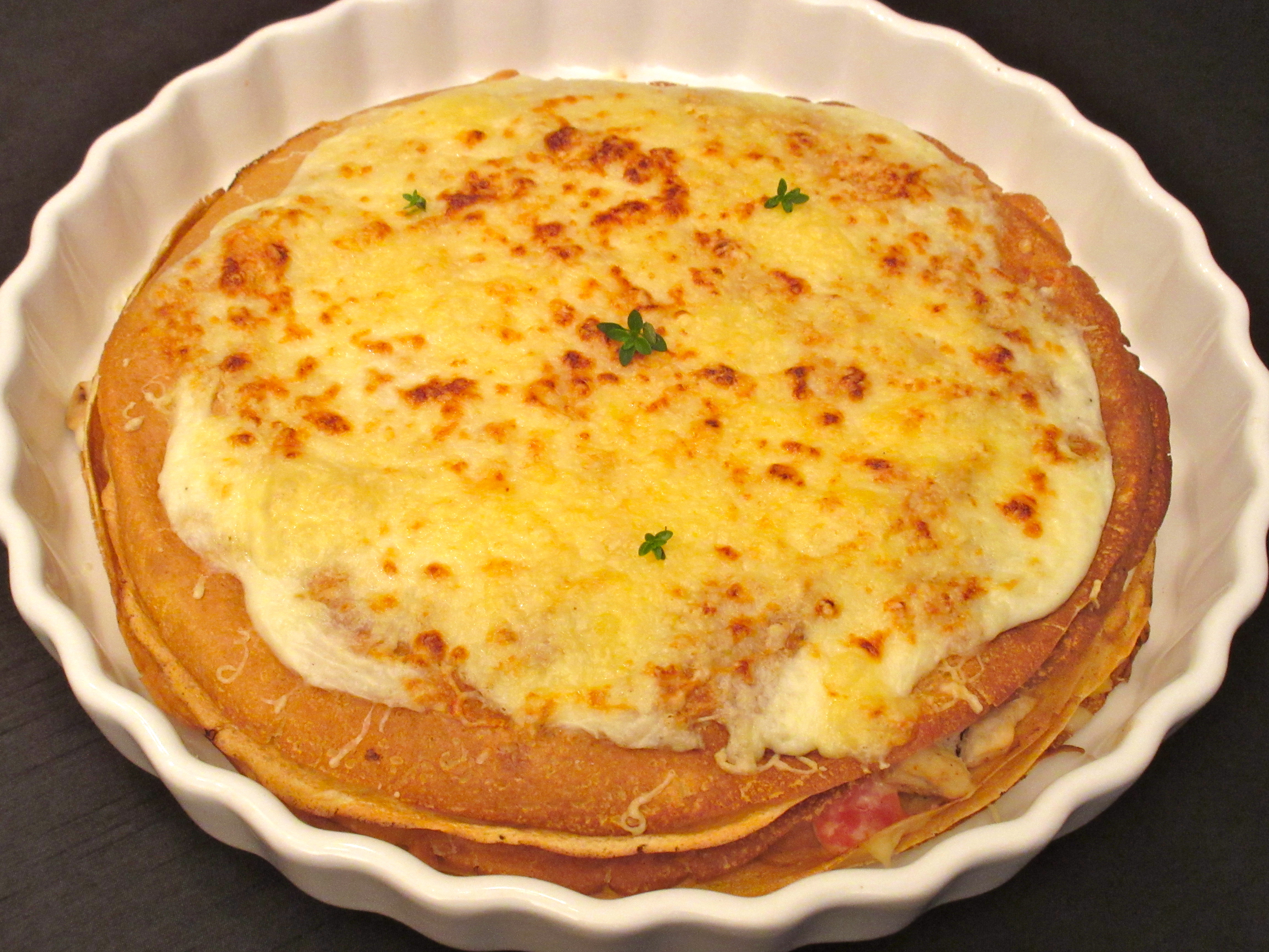 gâteau de crêpes,gâteau de crêpes saléescrêpes crêpes saléespoulet,blanc de poulettomatebéchamel allégéebéchamel goudacrêpes gratinéesplat complet