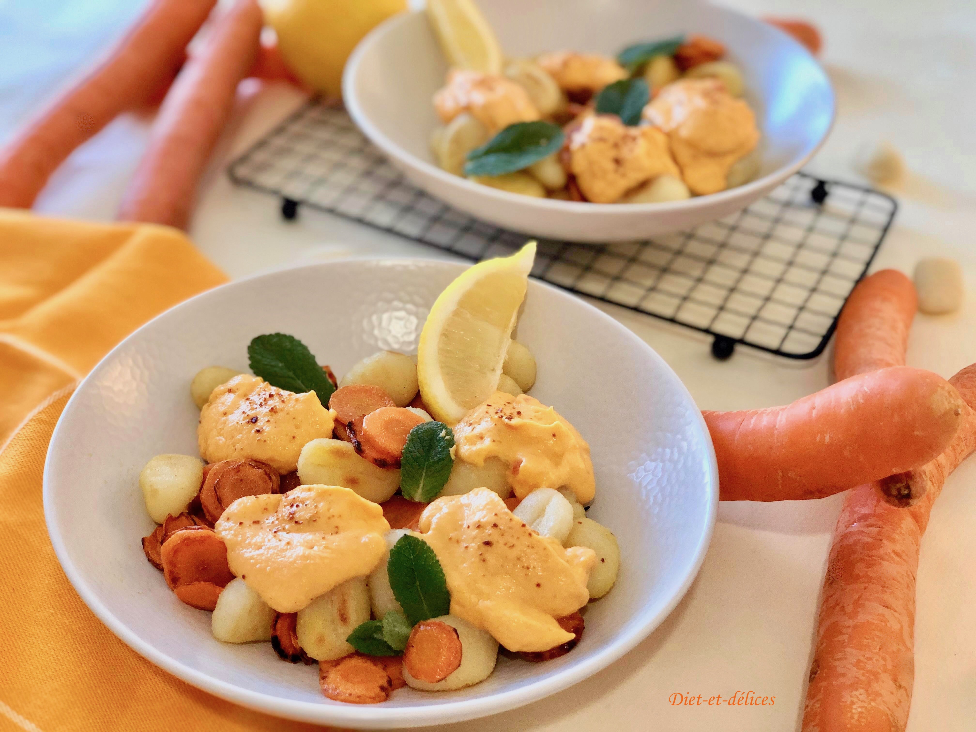 Accueil » Recettes » Légumes » Gnocchi aux carottes poêlées et sauce crémeuse à la carotte