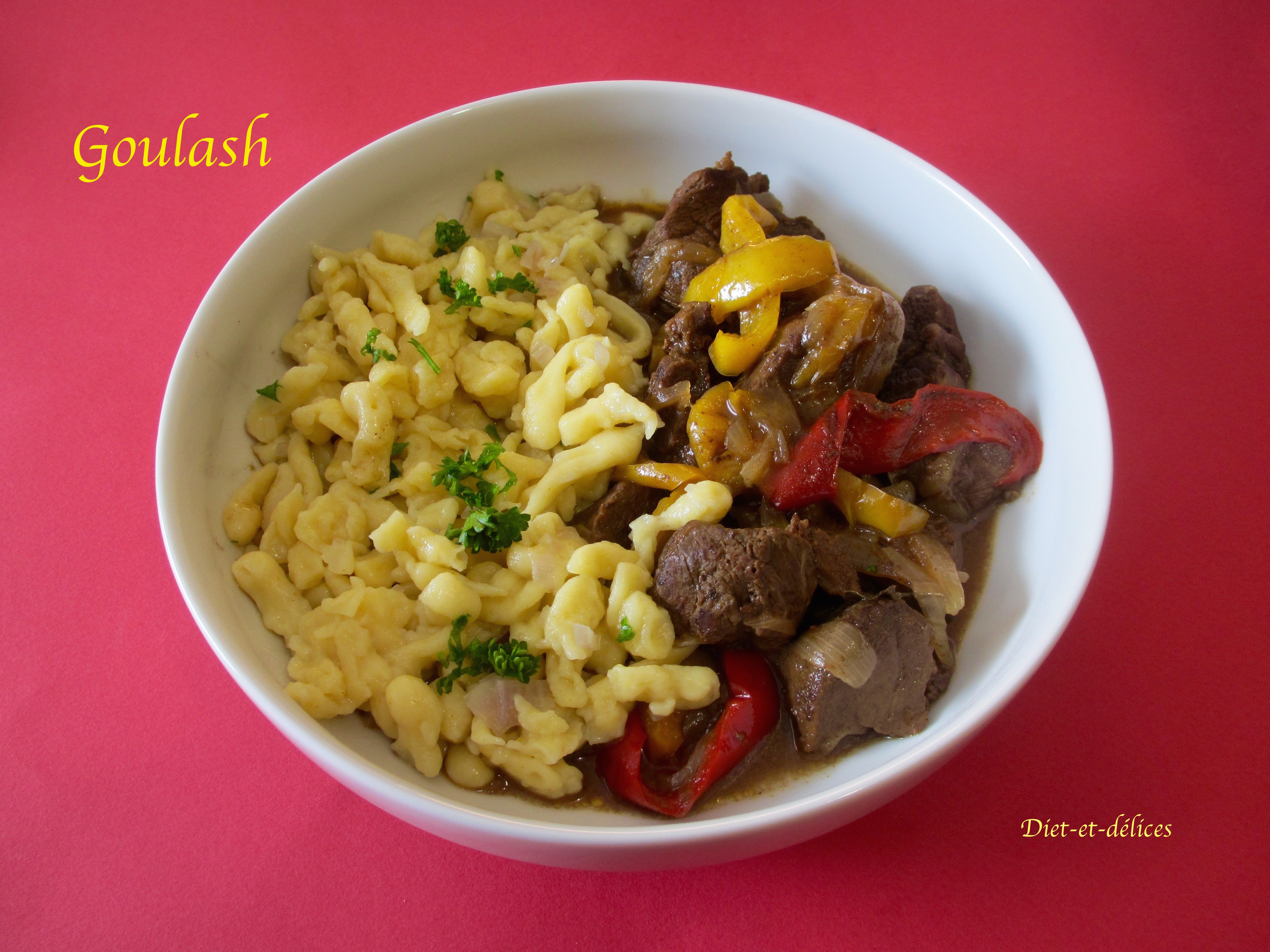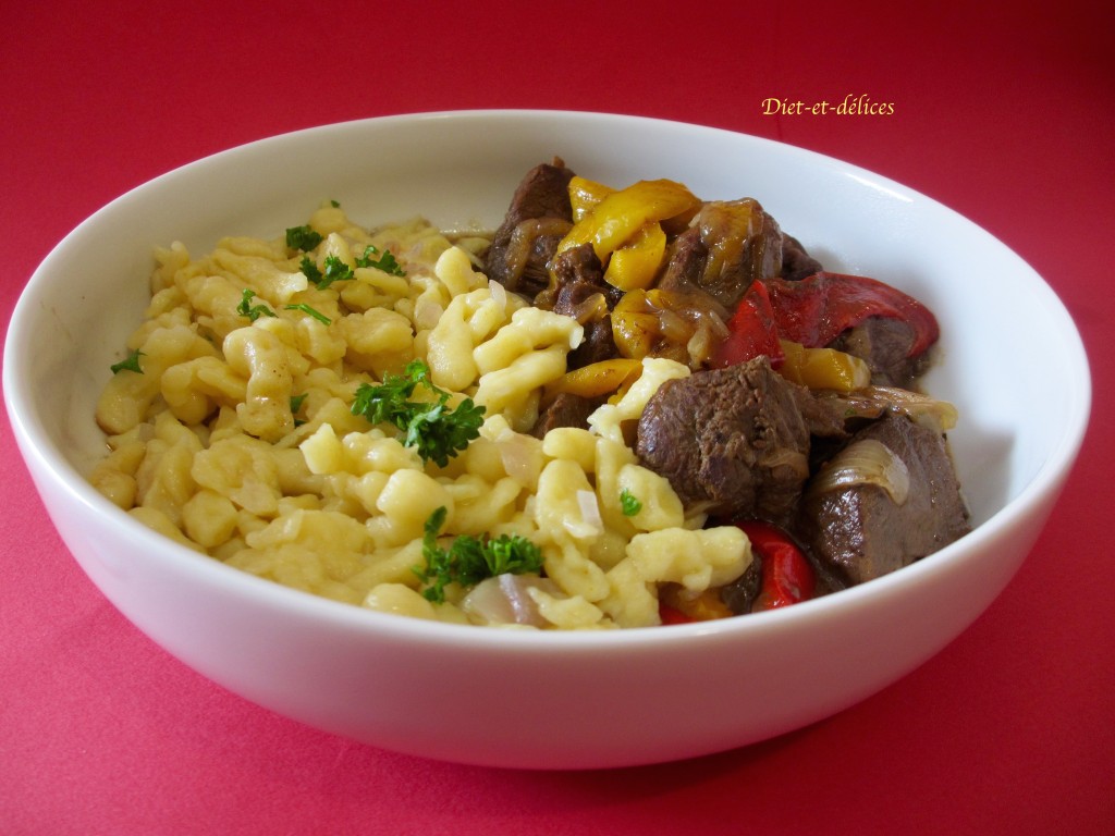 – Ici le goulasch est présenté avec des spätzles, pâtes alsaciennes à base d’oeufs et de farine.