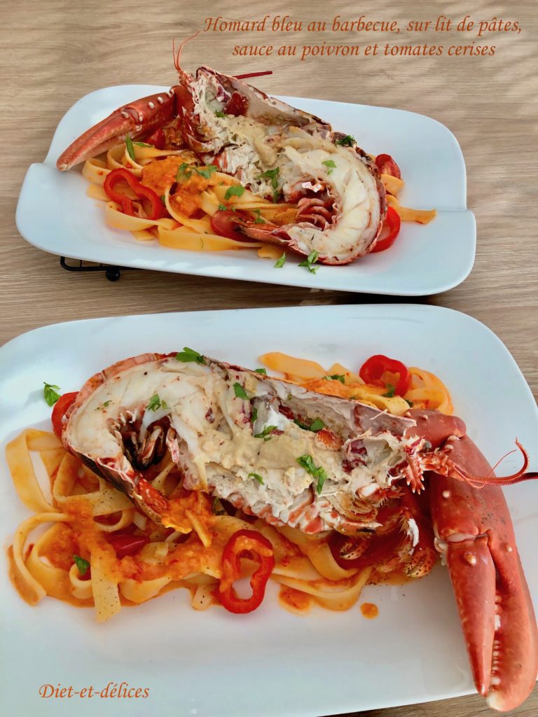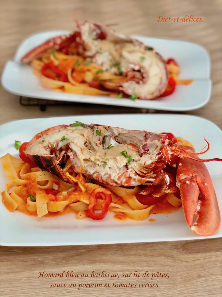 homard, homard bleu, barbecue, tagliatelles, pâtes, poivron, tomates cerises, crustacés