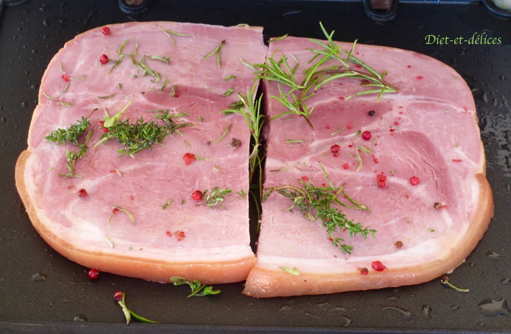 jambon, sarriette, thym, jambon braisé, romarin, cuisine rapide jambon braisé aux herbes, baies roses, plancha
