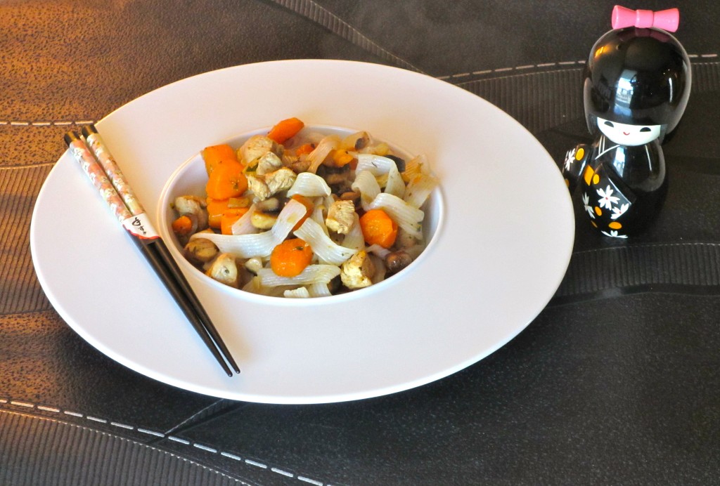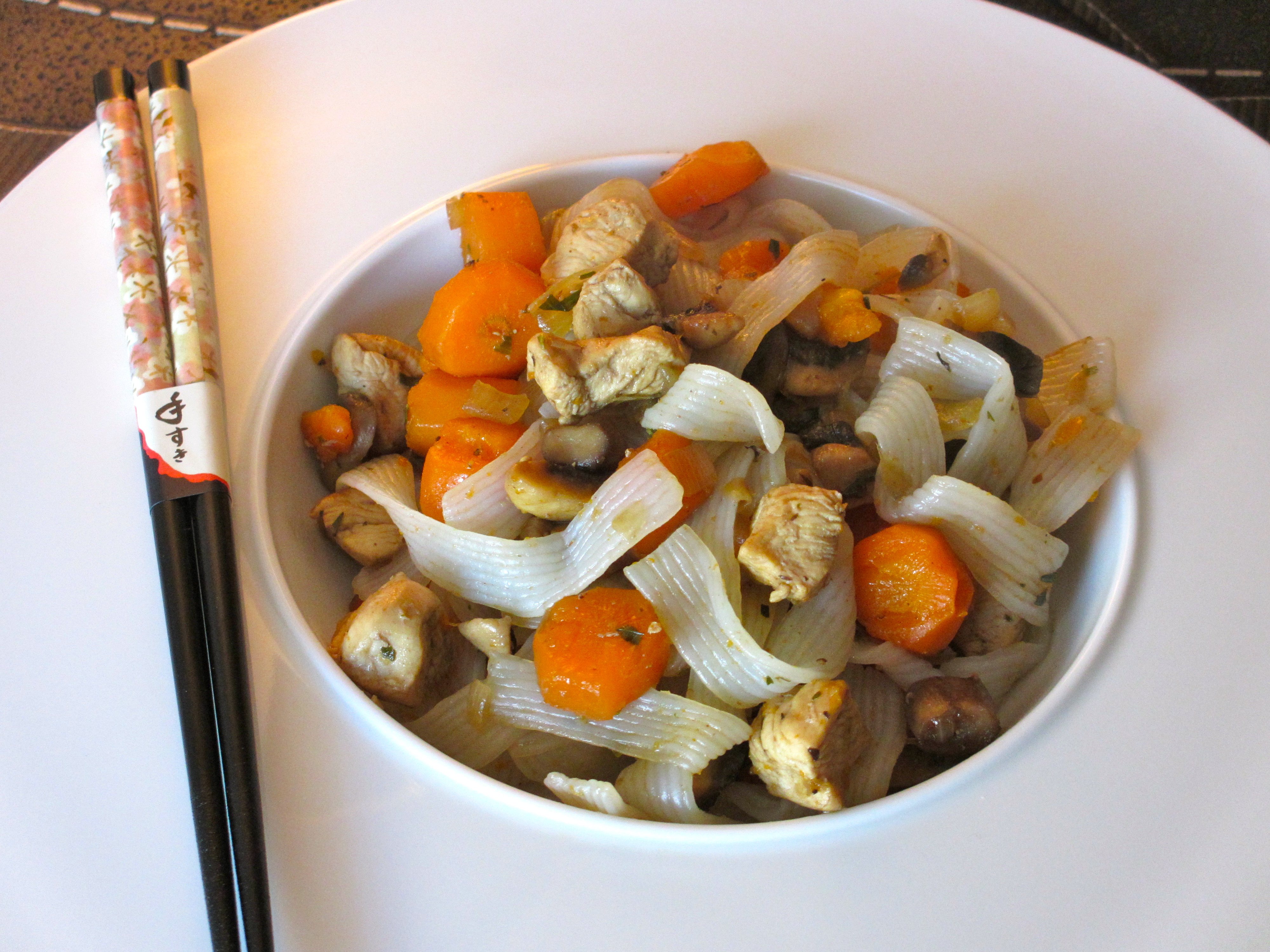 kishimen, pâtes de konjac, konjac, japonais, plat japonais, féculents, carottes, sauce soja,oignon, champignons, champignons frais, diététique, poulet, filet de poulet,plat complet, recette diététique, recette allégée,estragon