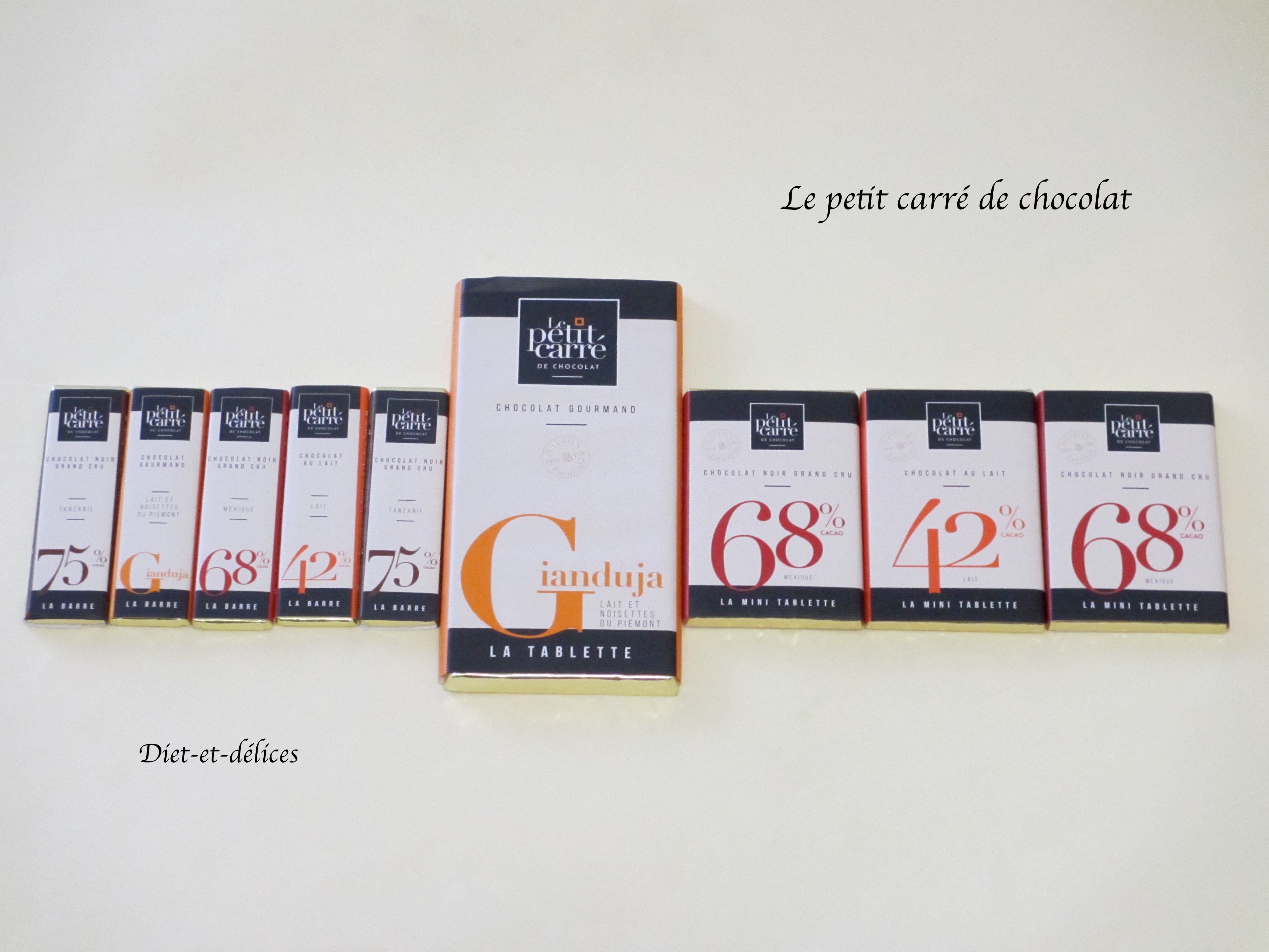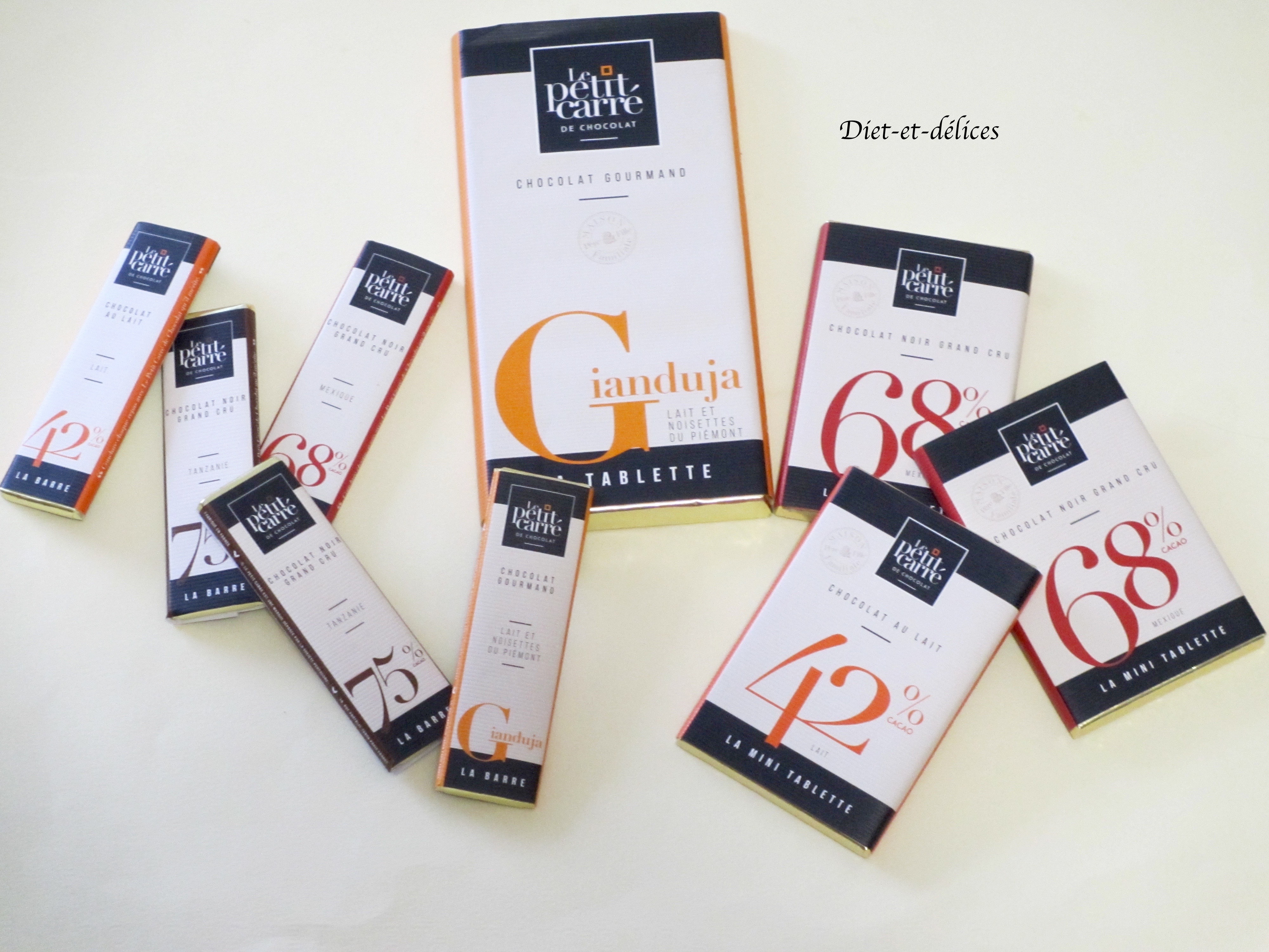Ces différentes variétés du Petit Carré de Chocolat se déclinent sous différents formats : un sachet de 20 carrés de 5g, des barres de 10g, des mini tablettes de 30 g et des tablettes de 90g.