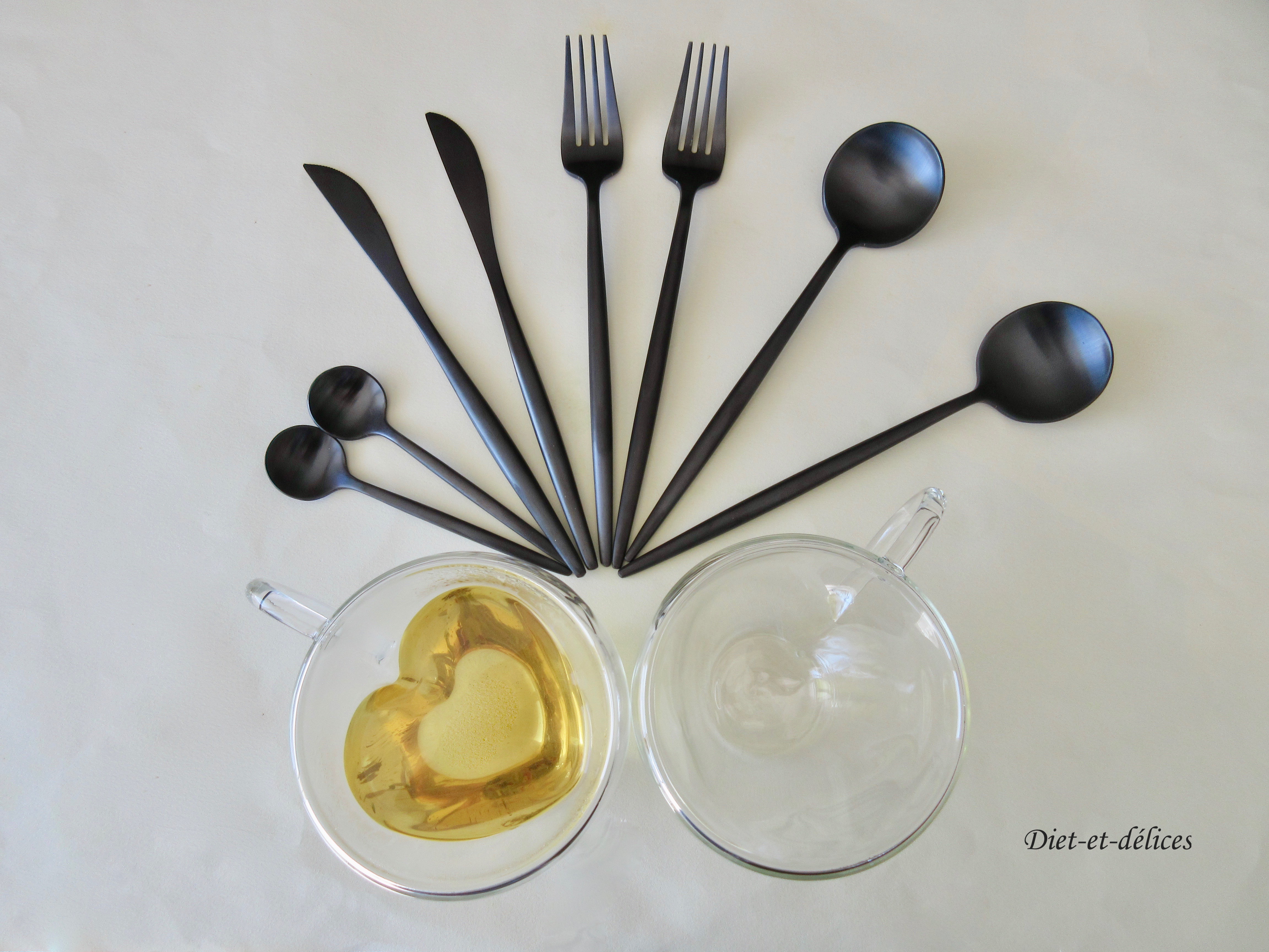 - 2 ensembles de couverts 4 pièces en acier inoxydable, couleur noir. Chaque ensemble se compose d’une fourchette, d’un couteau, d’une cuillère à soupe ainsi que d’une cuillère à café. Avec leurs manches longs et fins, ils permettent un design raffiné.