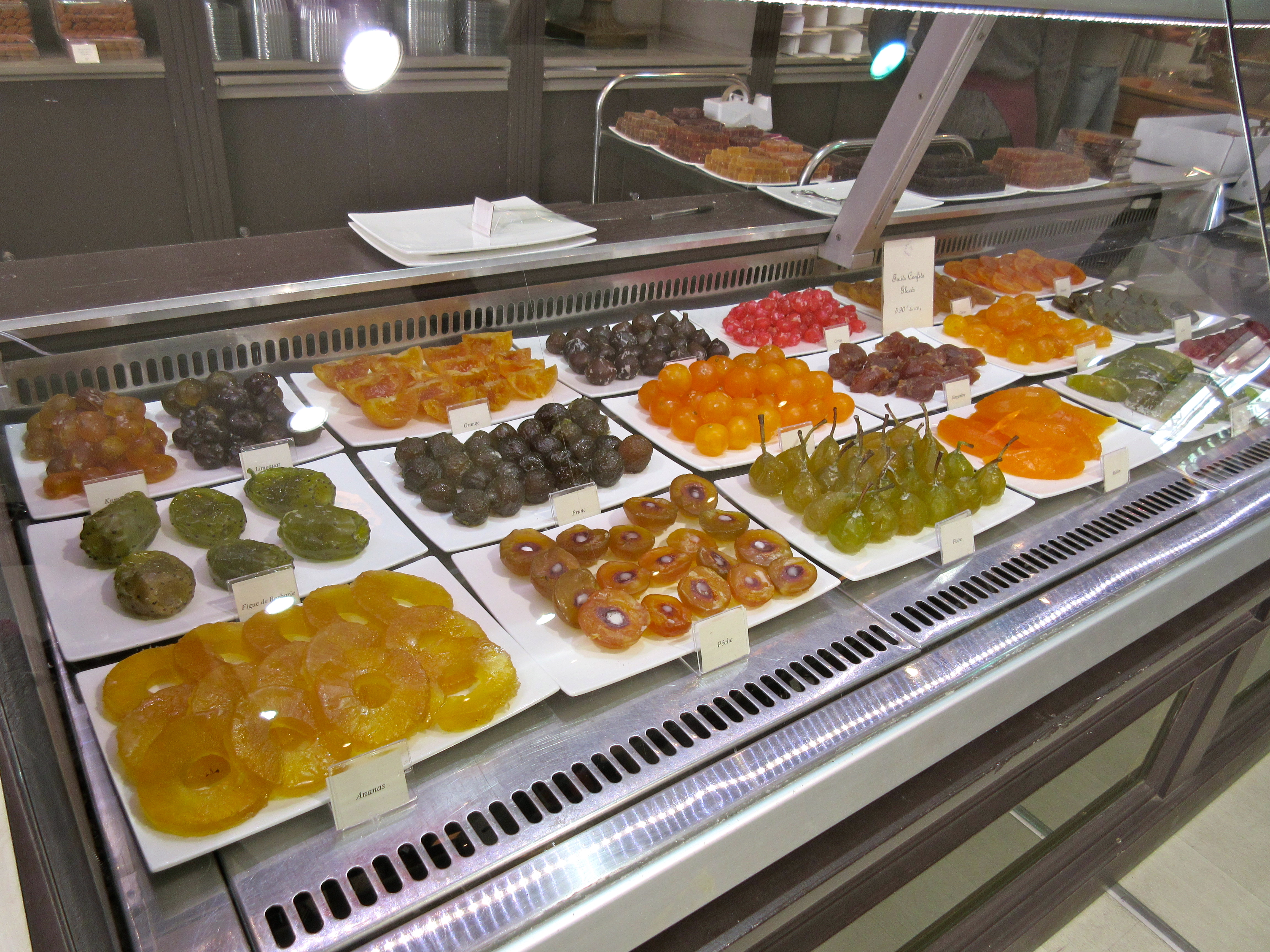 Parmi les fruits confits, une large gamme s’offre à vous : melon, ananas, orange, citron, gingembre, cerise, angélique, marrons, poires…