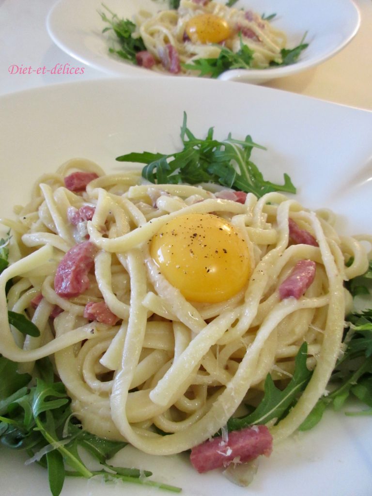 - Dans des assiettes à pâtes, mettre quelques poignées de roquette. Ajouter les pâtes puis déposer délicatement le jaune d’oeuf.