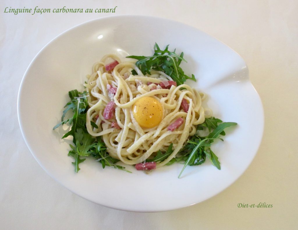 - Lorsque les pâtes sont cuites, remettre à chauffer les lardons de canard et y ajouter 4 louches d’eau de cuisson des pâtes.