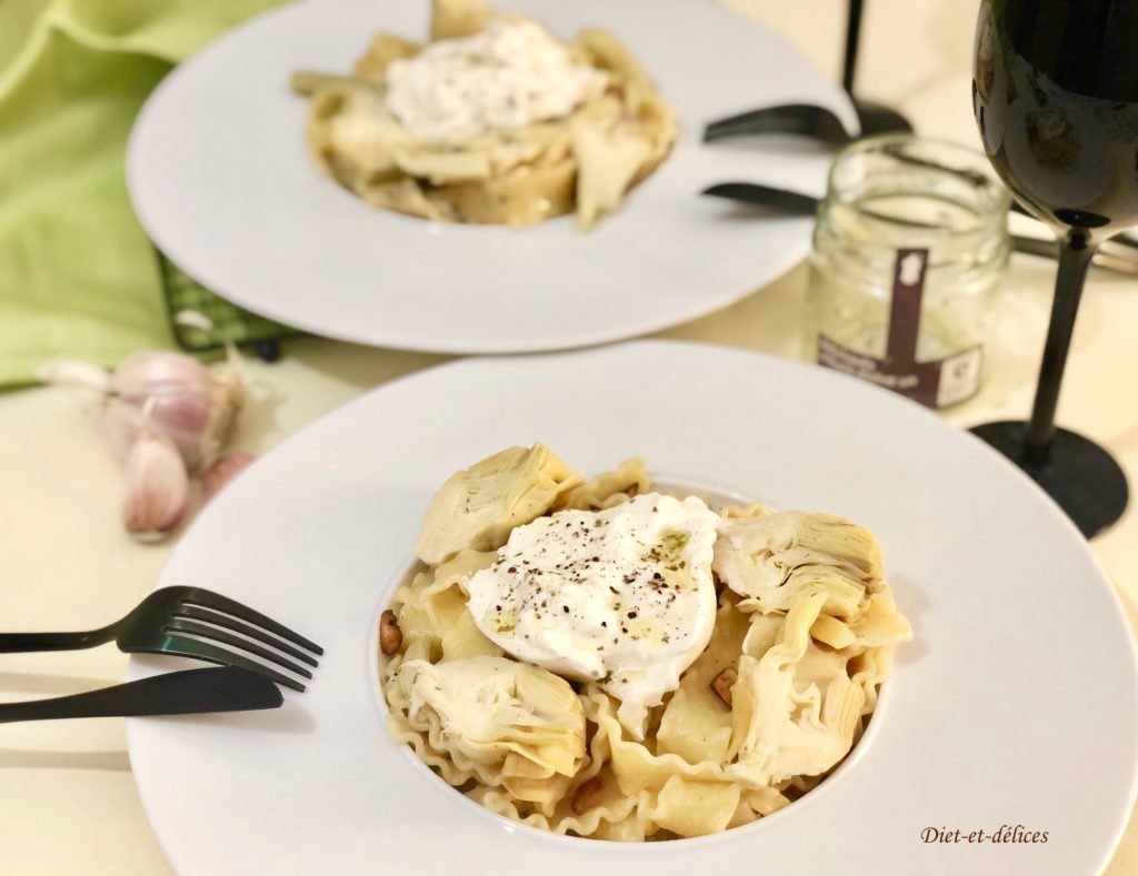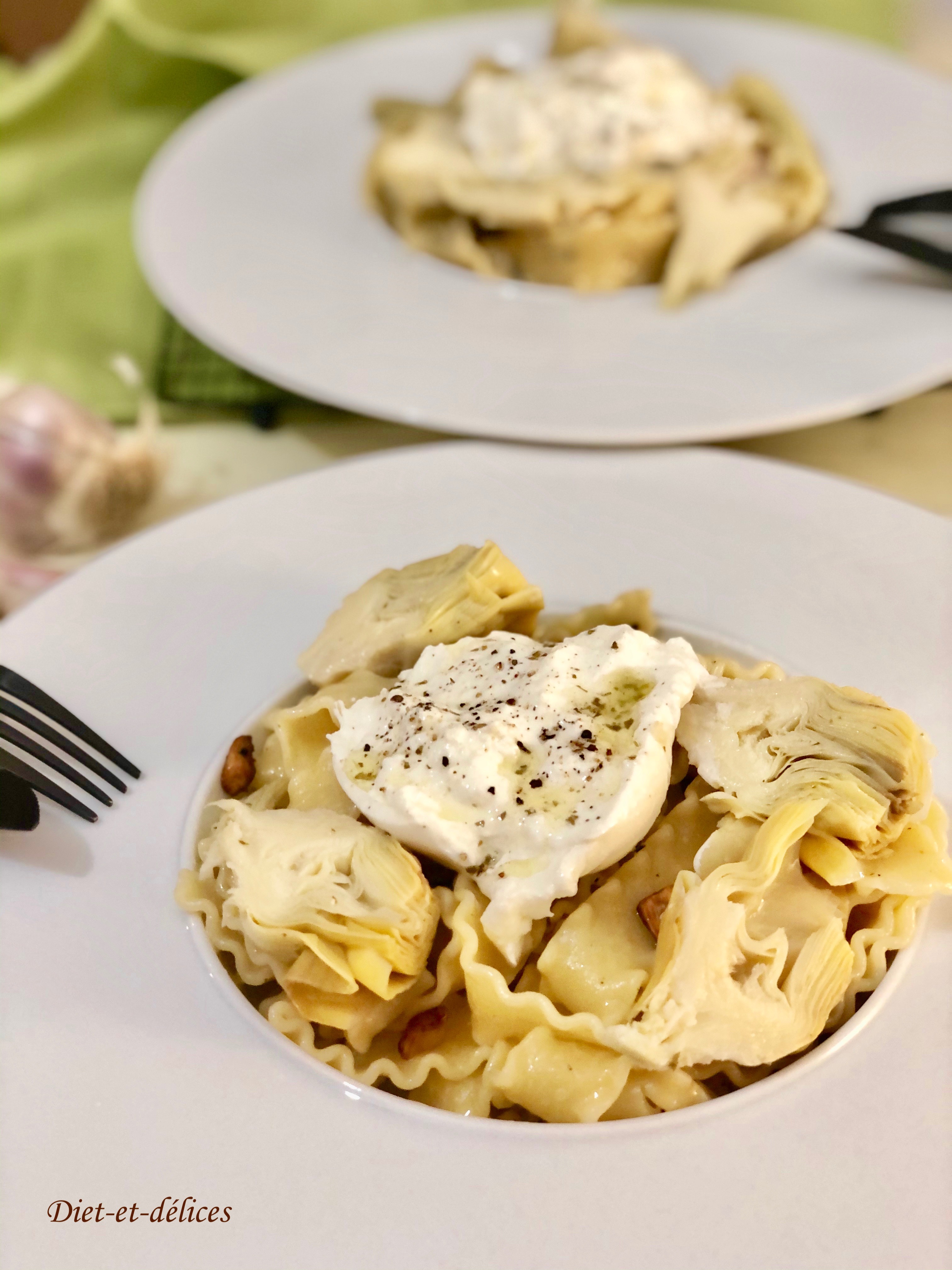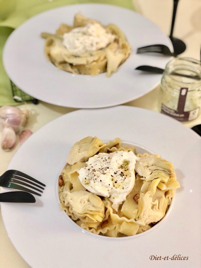 mafaldine, pâtes, artichaut, burrata, pâtes aux artichaut, ail, burrata à la truffe, plat complet