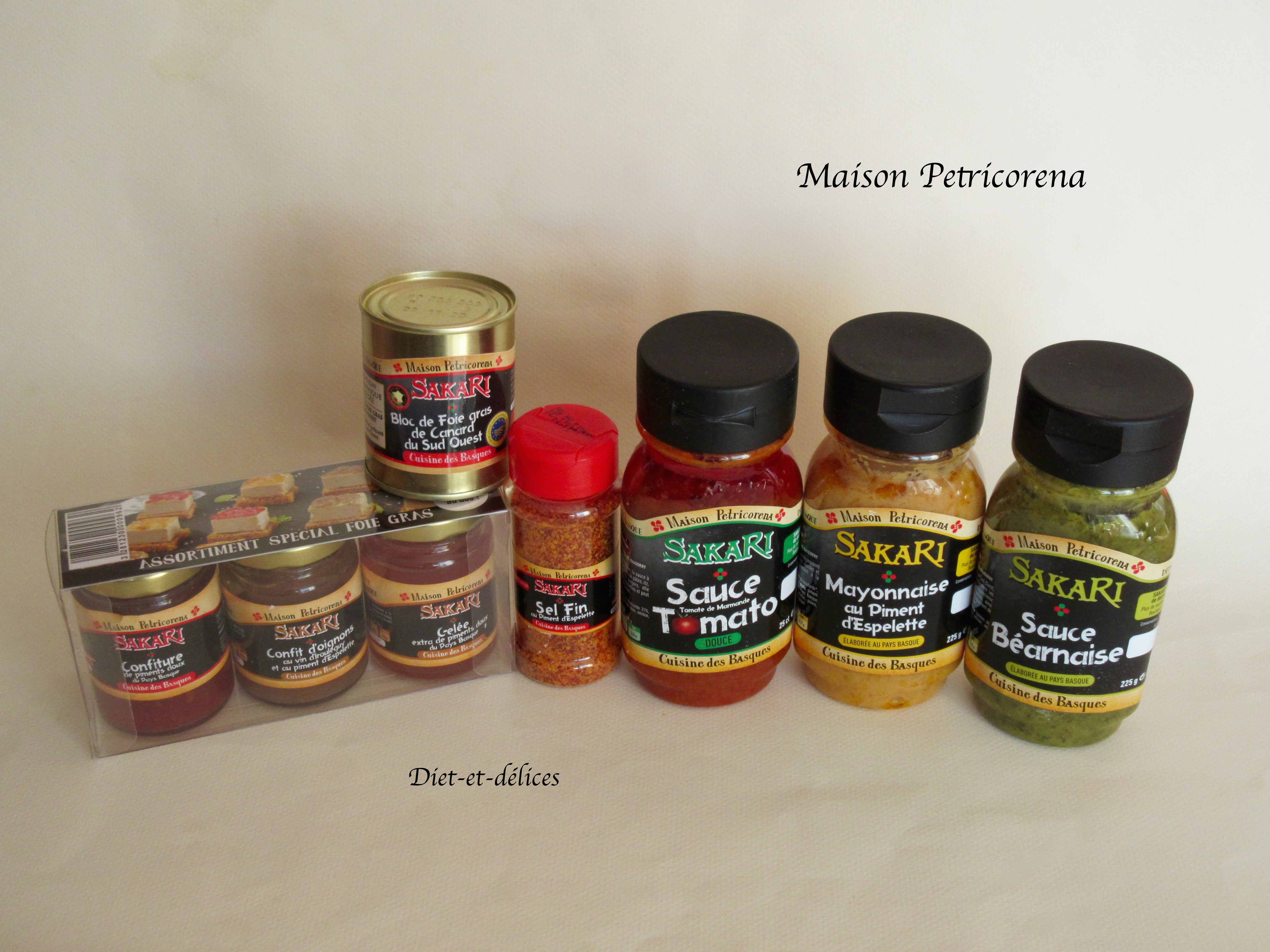 Je remercie la Maison Petricorena pour avoir renouvellé ce partenariat. J’ai eu le plaisir de recevoir de jolis produits aux saveurs basques : les nouvelles sauces : la sauce béarnaise, la mayonnaise au piment d’Espelette et la sauce tomato aux tomates marmandes ! J’ai également eu le plaisir de recevoir du sel fin au piment d’Espelette, un bloc de foie gras de canard du sud ouest ainsi qu’un assortiment spécial foie gras qui comprend une confiture de piments doux du pays Basque, un confit d’oignons au vin d’Irouleguy et au piment d’Espelette et une gelée extra de piments doux du pays Basque.