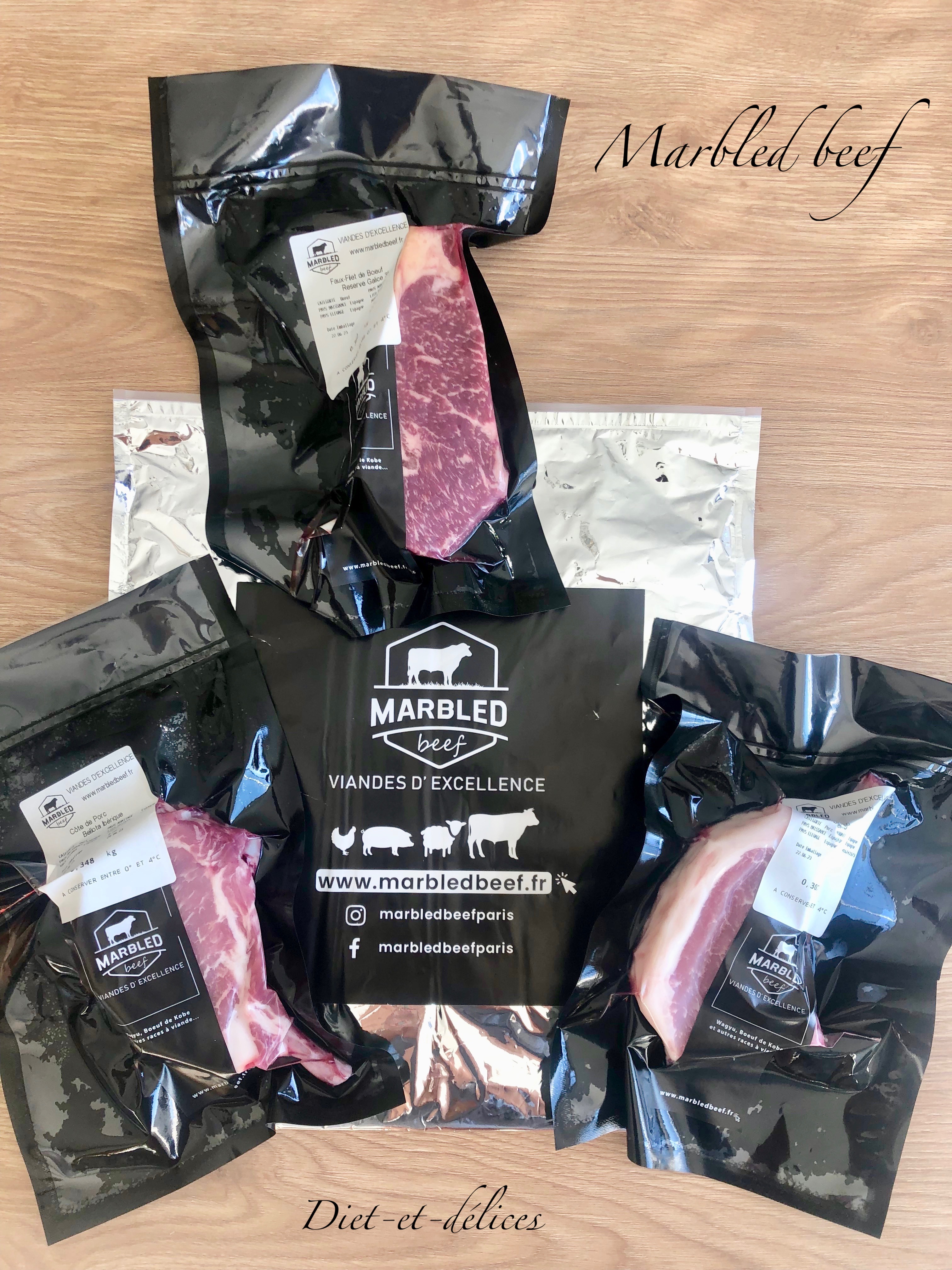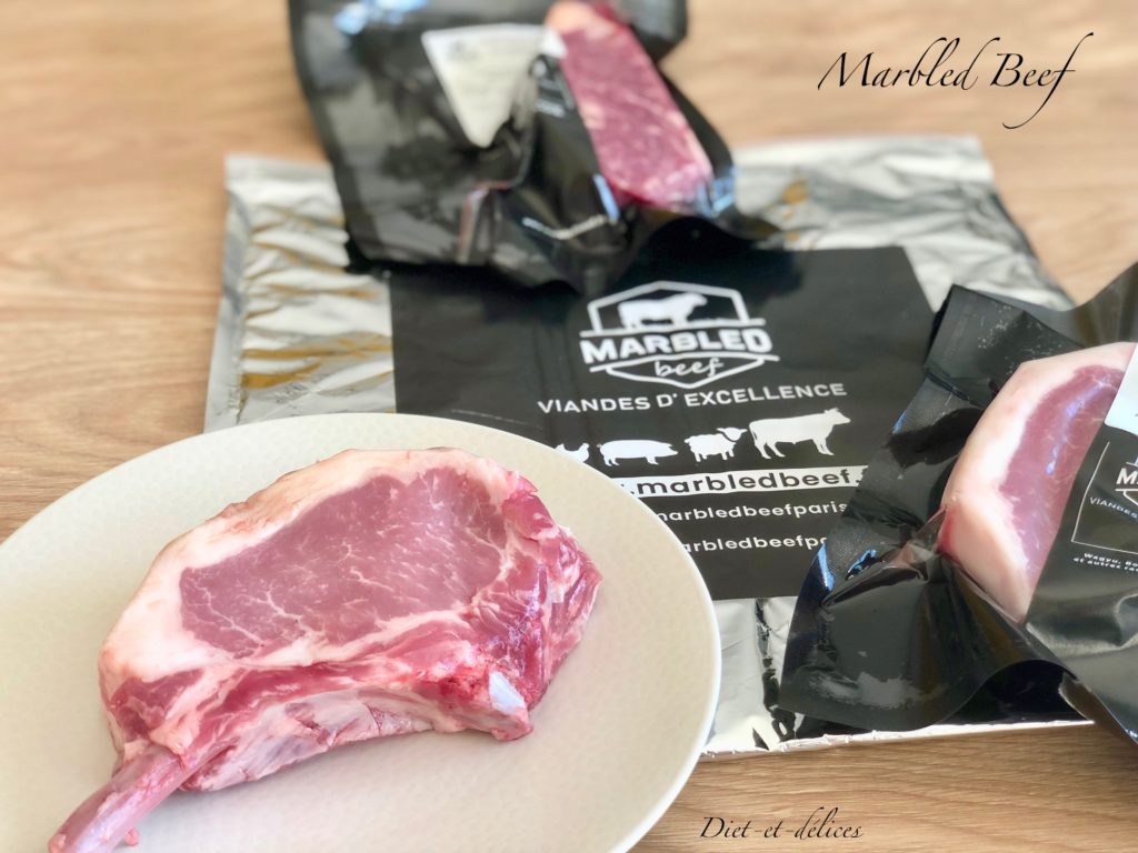 Je remercie grandement l’entreprise Marbled Beef. J’ai eu le plaisir de recevoir du faux filet de Boeuf Réserve Galice 35J et des côtes de porc Bellota Ibérique.