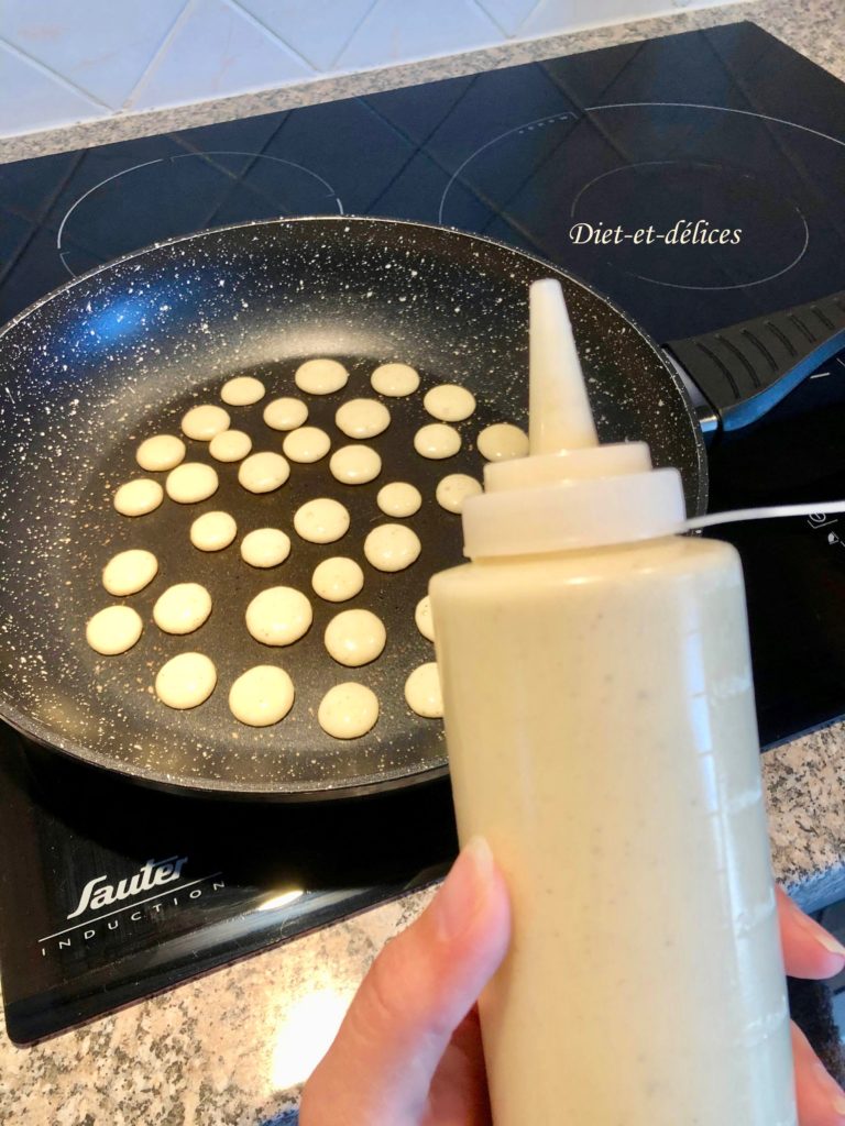 Dans une poêle légèrement beurrée, verser des mini ronds de pâtes. Les laisser cuire quelques instants (environ 1 minute) jusqu’à ce que la pâte commence à faire des bulles. Les retourner puis faire cuire l’autre face. Verser les mini pancakes dans un bol.