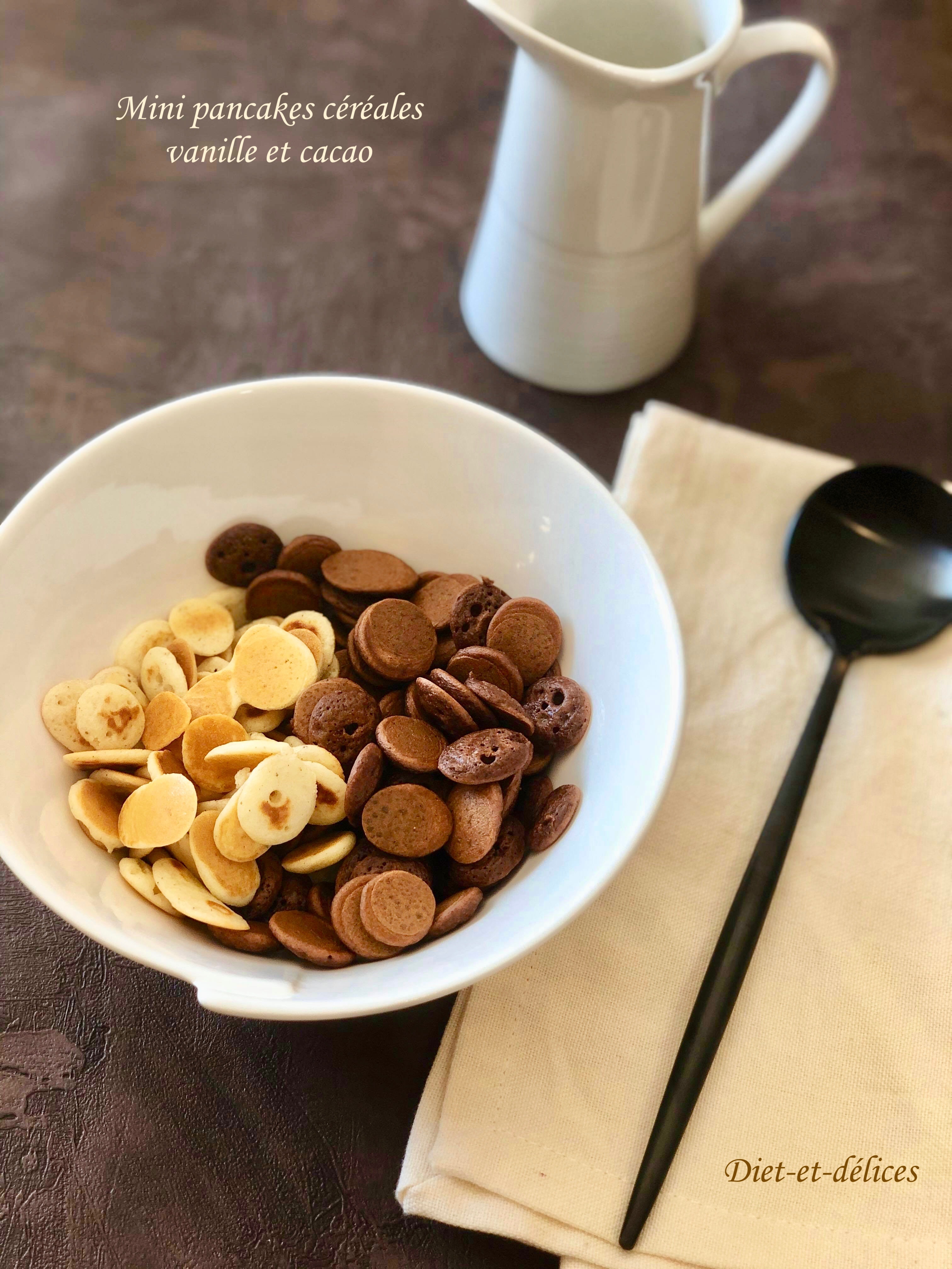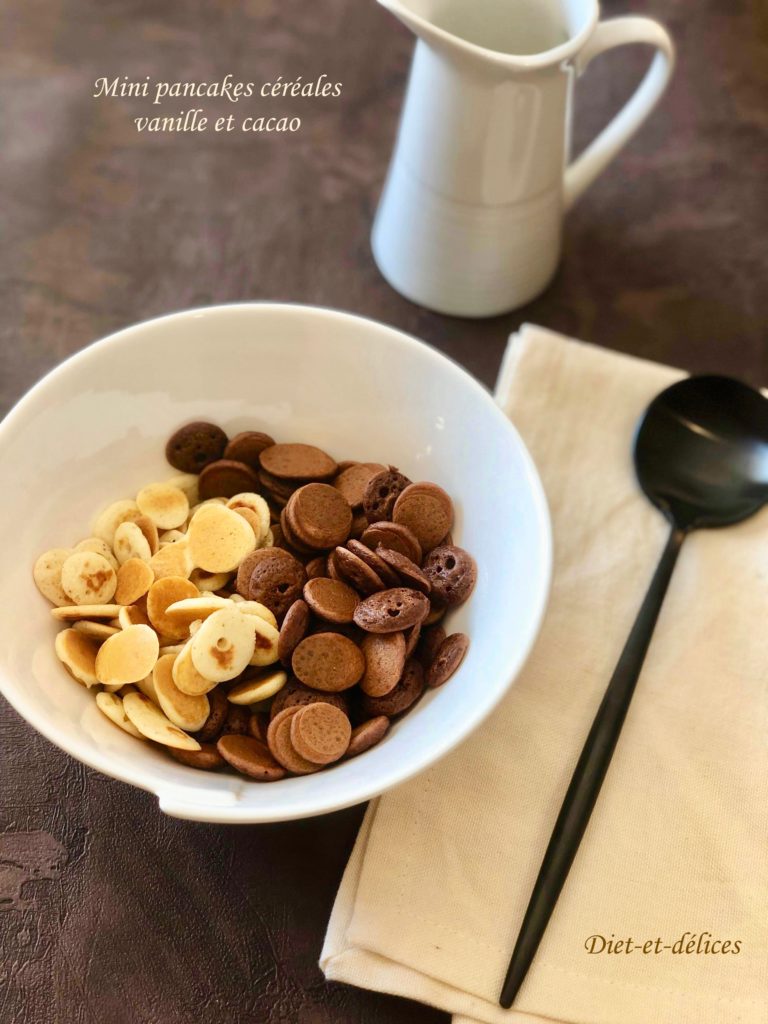 - Ajouter les mini pancakes au cacao dans le bol et arroser éventuellement de lait ou de lait végétal.