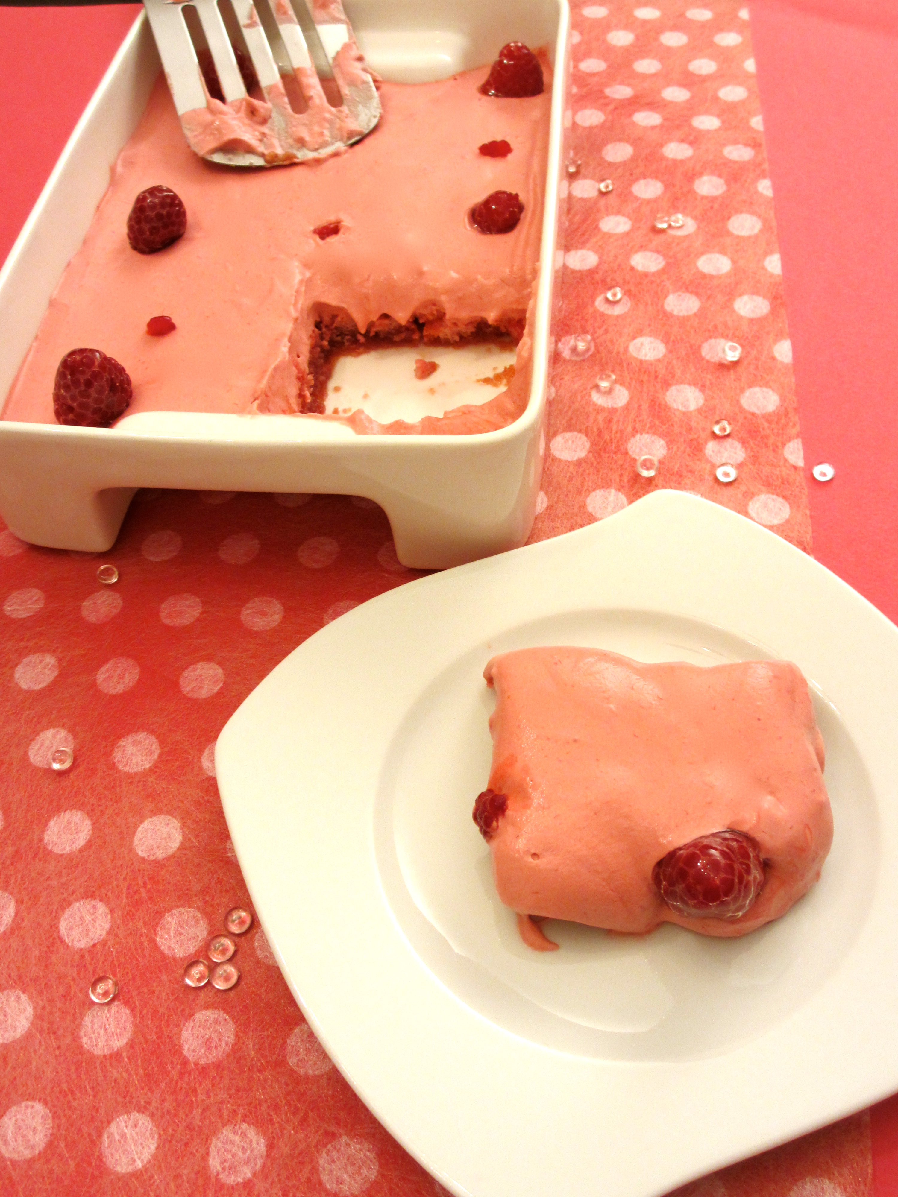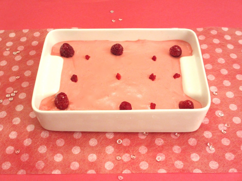 - Lorsque tout le fond du plat est tapissé de biscuits imbibés, verser la mousse aux framboises.