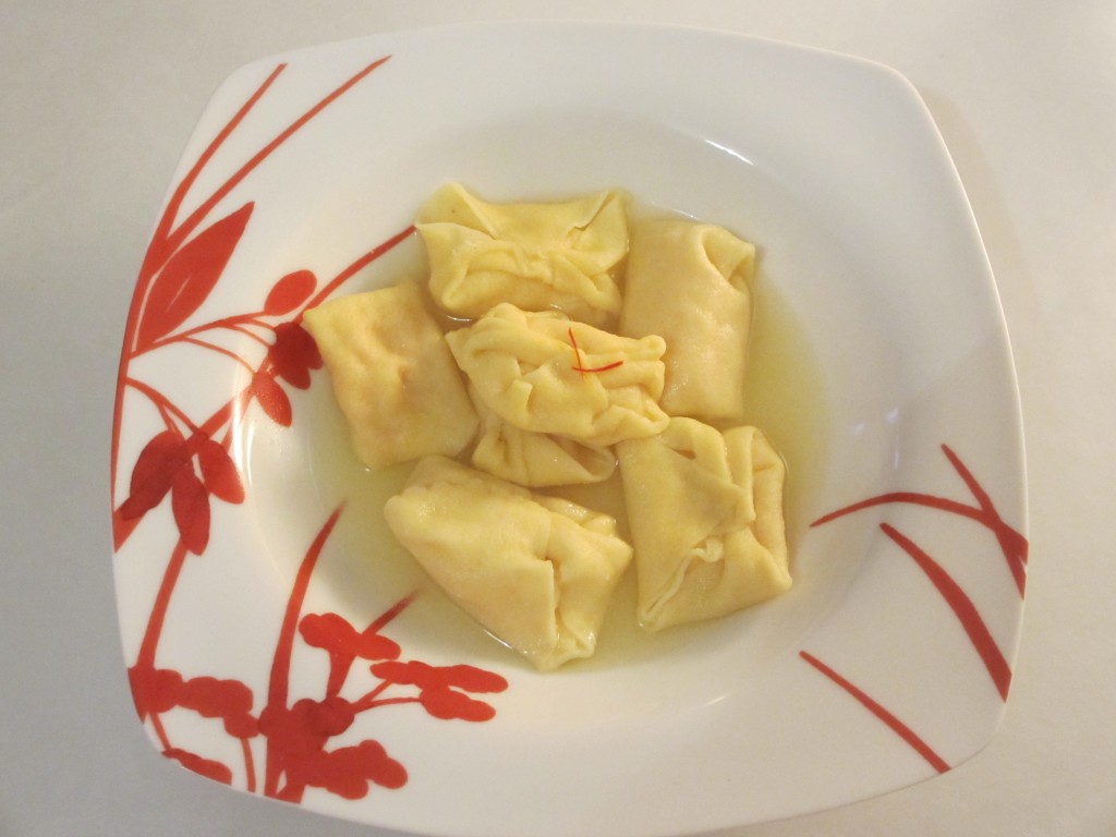 - Disposer les tortellis dans une assiette creuse et les recouvrir de bouillon safrané.