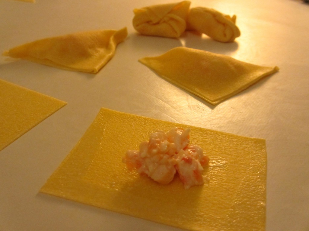 - Réaliser une pâte à raviole. La couper en carrés de 5 cm de largeur.
