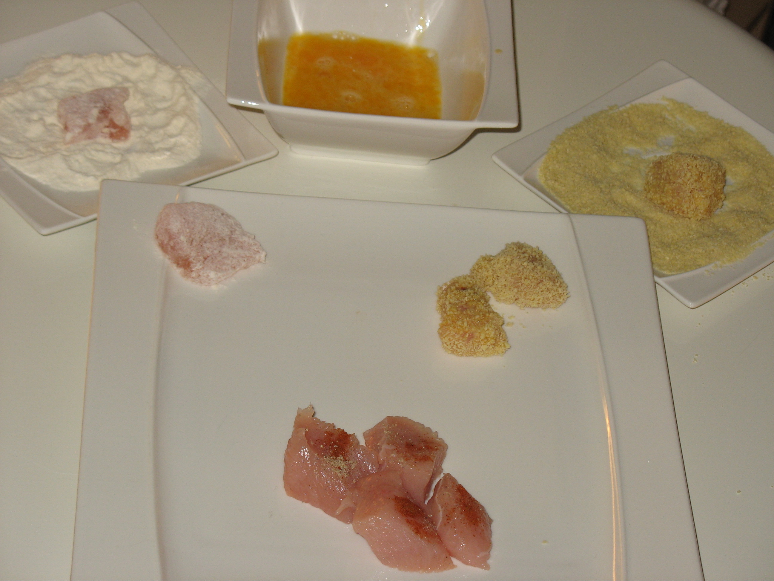 – Vous pouvez rajouter de l’emmental râpé à la chapelure ; on parlera alors de nuggets à la milanaise.
