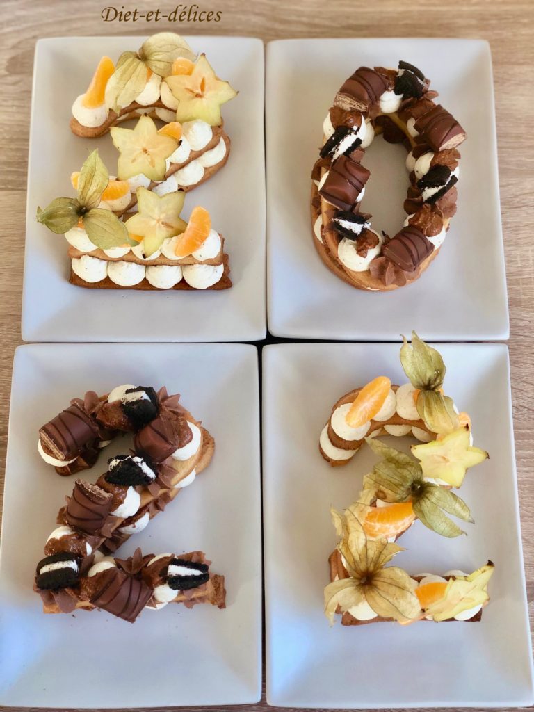 – Le « Number cake » est un gâteau en forme de numéro mais d’autres appellations sont possibles en fonction de la forme de biscuit utilisée : « Letter Cake » ou l’ « Alphabet Cake » ou le « Heart Cake »pour ceux en forme de coeur. Il se compose de deux étages de biscuits ayant la même forme afin de les superposer, de garniture qui ne coulent pas afin de maintenir les étages et de décorations diverses (fruits, fleurs, biscuits, chocolats…)
