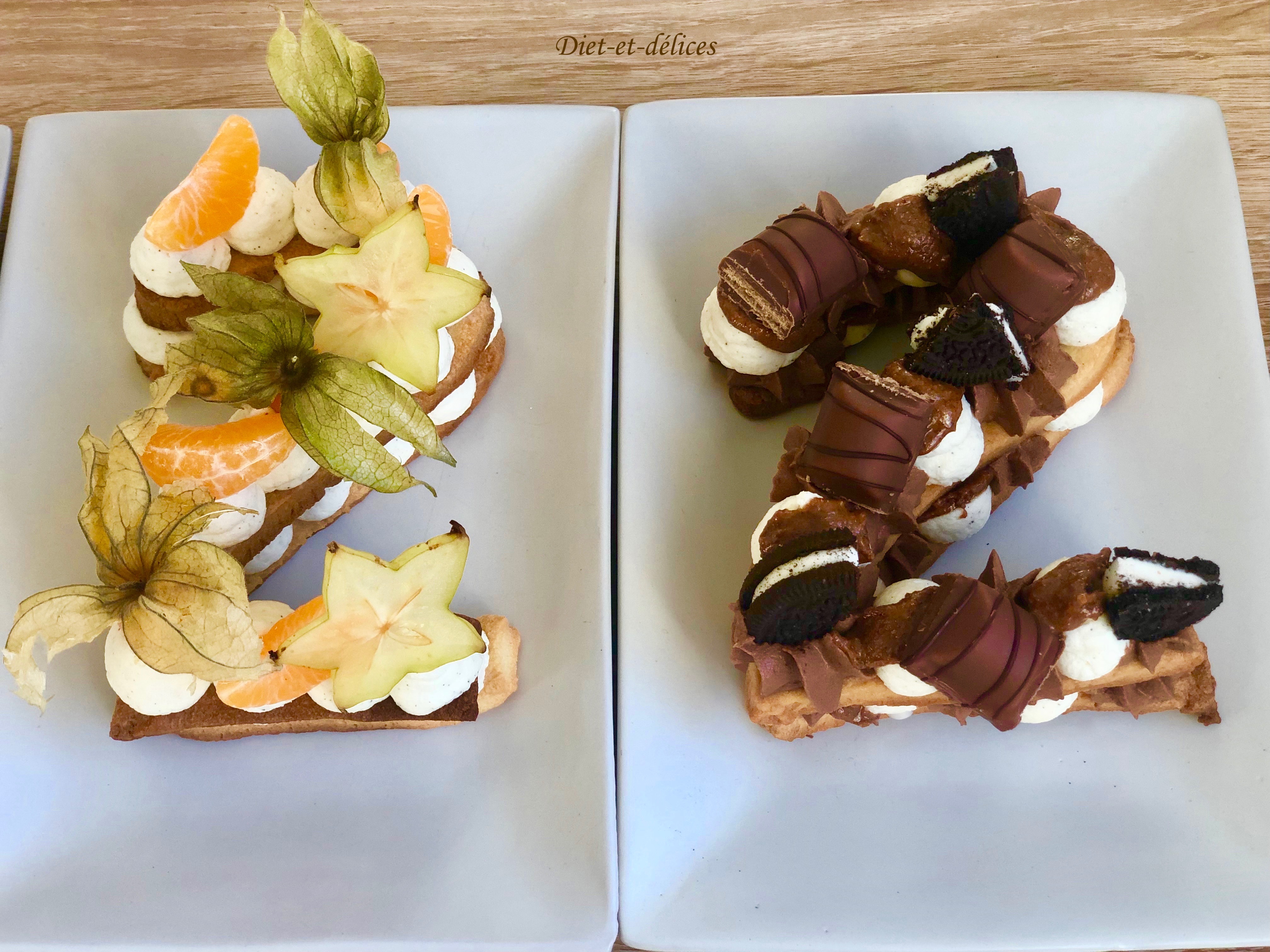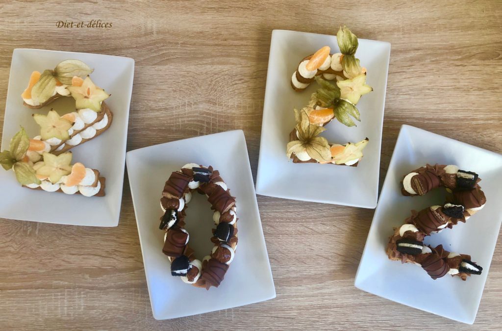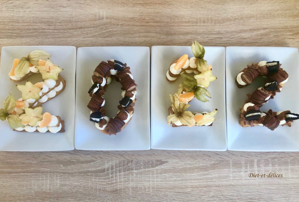 - Pocher la chantilly mascarpone vanille sur un 2 et un 0. Recouvrir d’un second biscuit puis repocher la chantilly. Décorer avec quelques quartiers de clémentines, de fines tranches de carambole et des physalis.