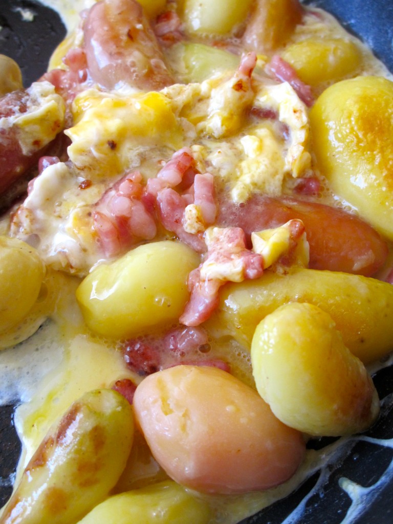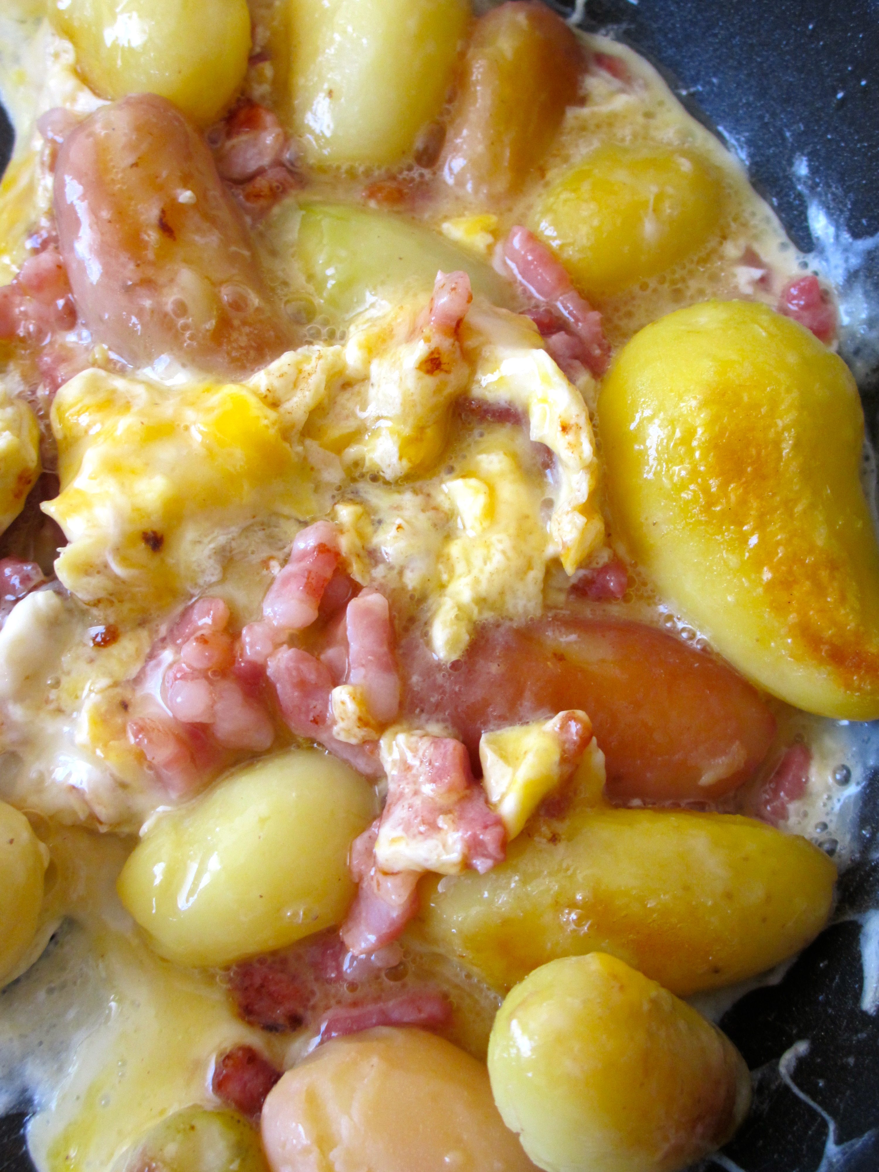 - Verser les oeufs dans la poêle chaude sur les pommes de terre et les lardons.