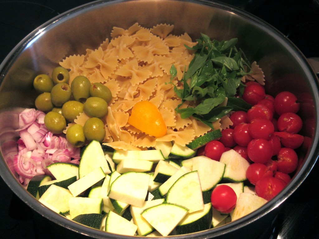 one pan pasta, pâtes,cuisine italienne, one pan pasta aux légumes, courgettes, tomates cerises, one pot pasta, one pot pasta aux légumes, pâtes aux légumes, olives, basilic, plat complet, épices à couscous,farfalles, cuisine saine, diététique, cuisine diététique, végétarien