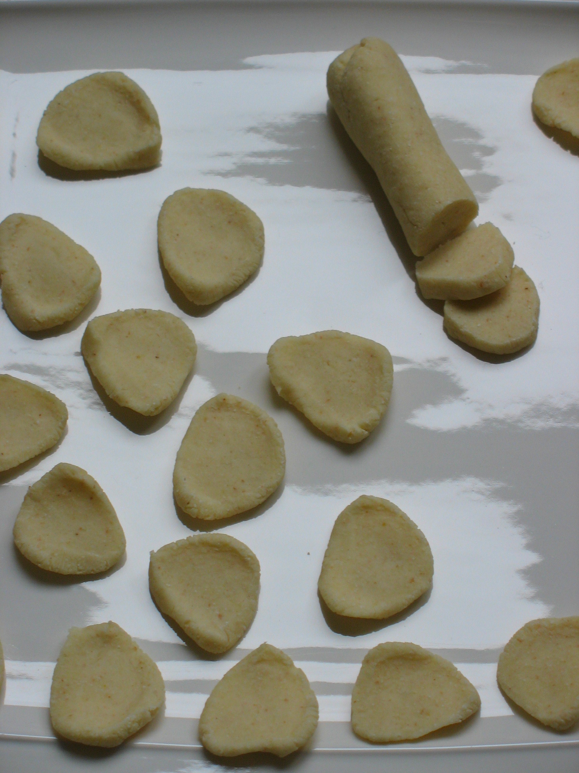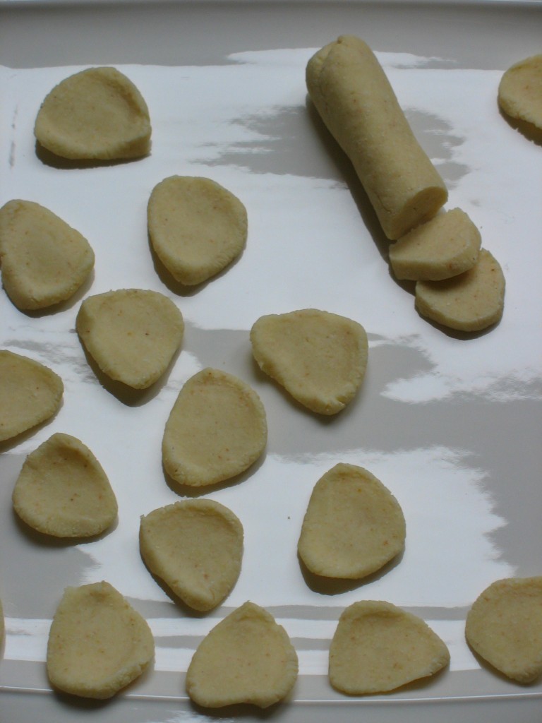 Couper le boudins en rondelles de 2 mm d’épaisseur. Façonner ces rondelles en forme de coquille. Accentuer leur forme en exerçant une pression avec le pouce au centre de chacune d’elles.