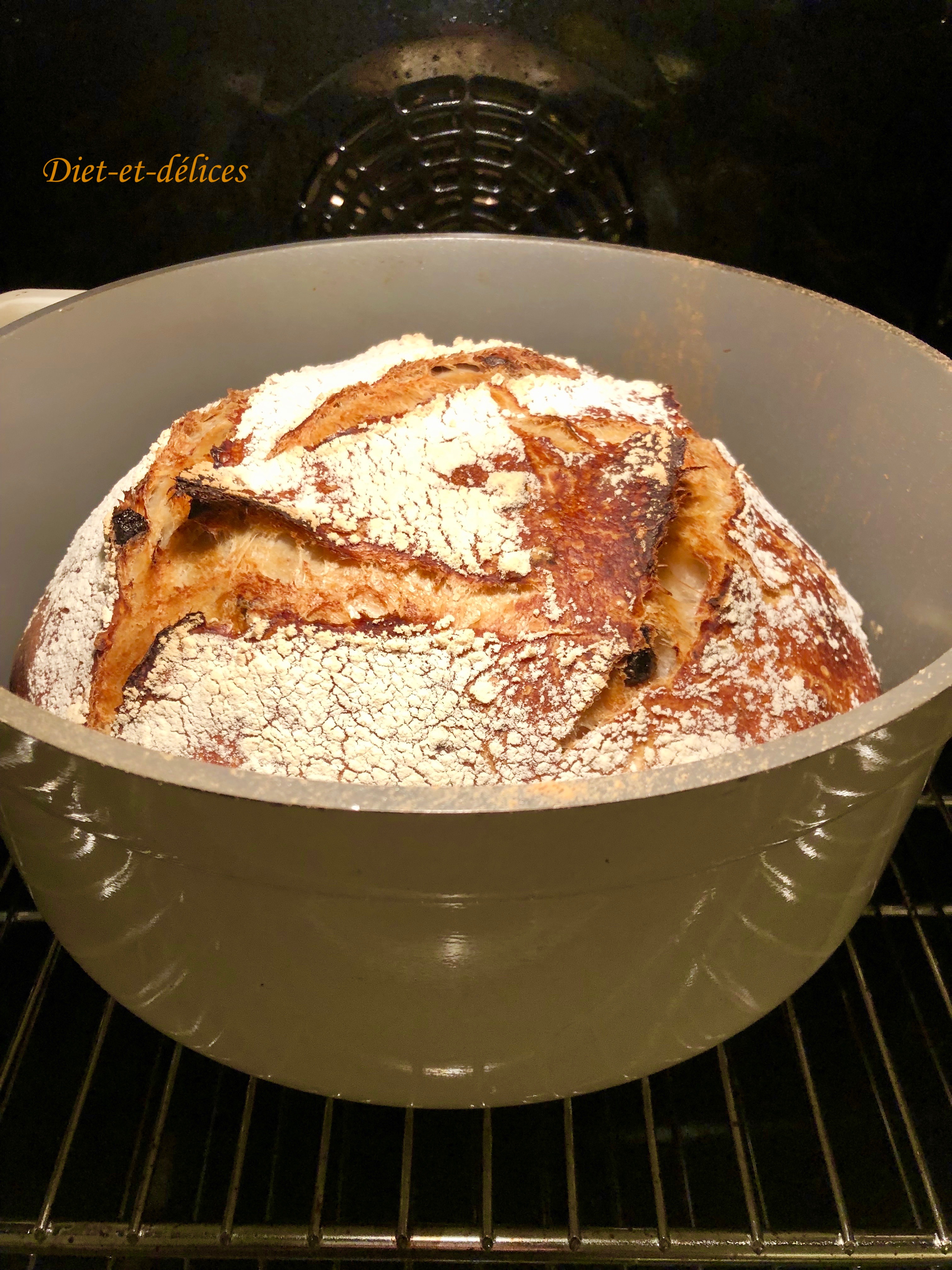 - Régler le four sur 240°C puis laisser cuire pendant 45 minutes. Retirer le couvercle puis poursuivre la cuisson pendant 15 minutes afin que le pain soit bien coloré.