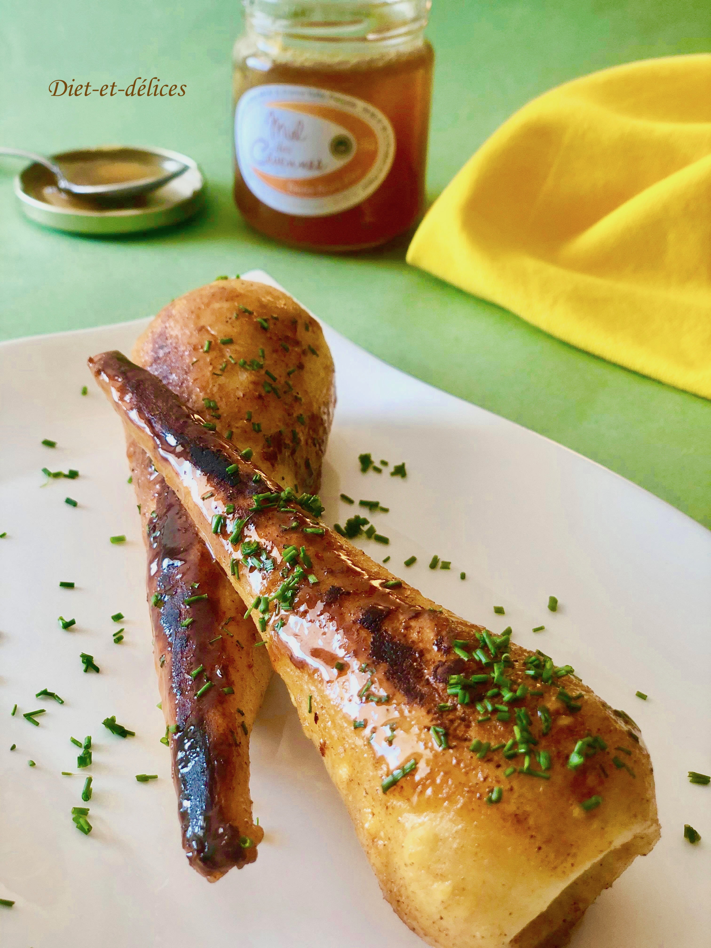 - Lorsqu’ils ont pris une jolie couleur, au bout de 10 minutes environ, ajouter le miel puis poursuivre la cuisson environ 2 minutes, en continuant de les arroser.