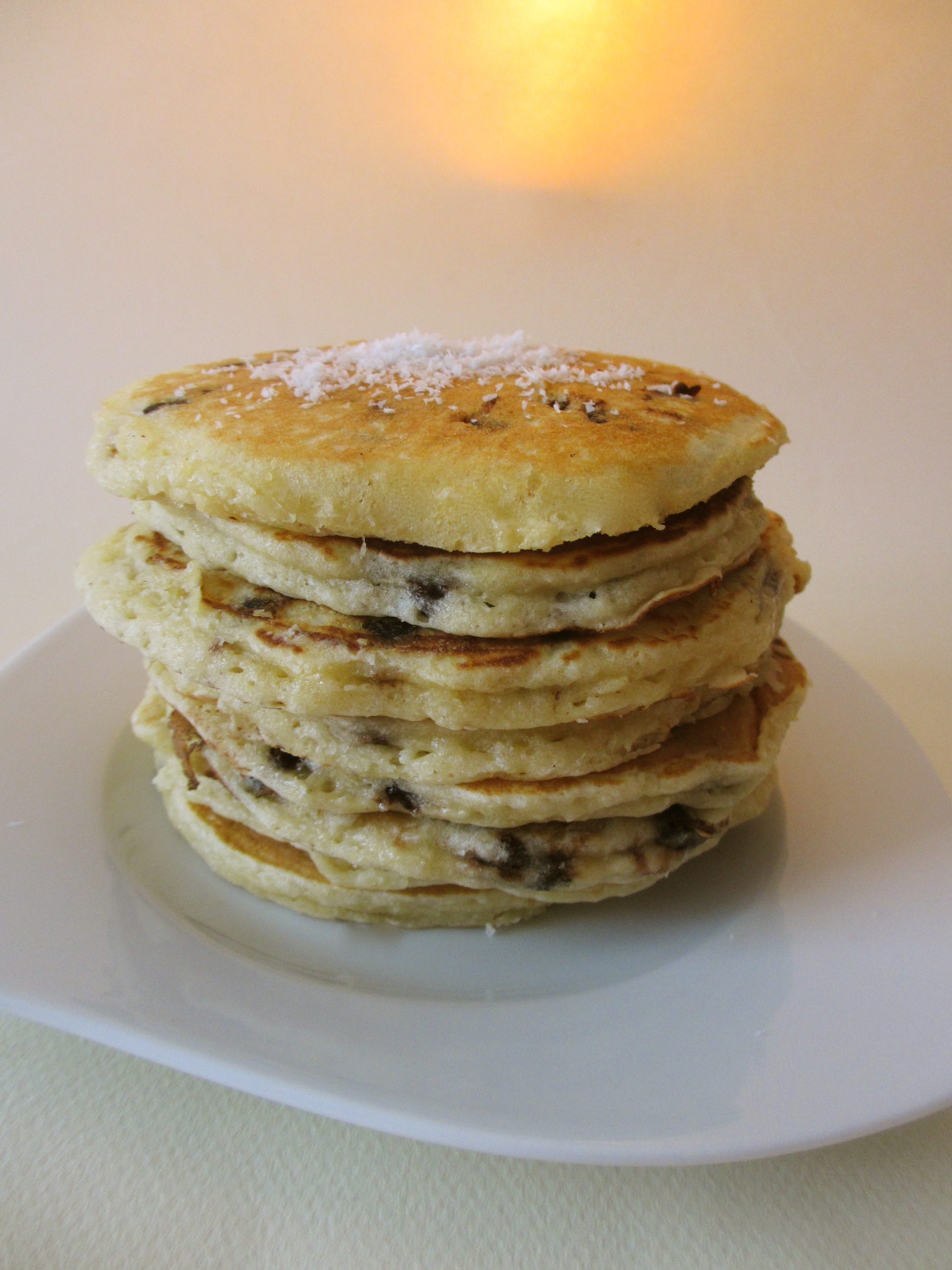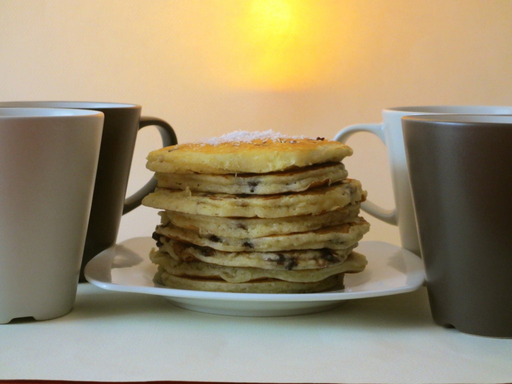 pancakes, noix de coco râpée, pépites de chocolat , pancakes à la noix de coco, noix de coco râpée et pépites de chocolat, petit déjeuner , pancakes à la noix de coco et pépites de chocolat, cuisine du monde, cuisine américaine, recette américaine, eau pétillante, pâte à pancakes
