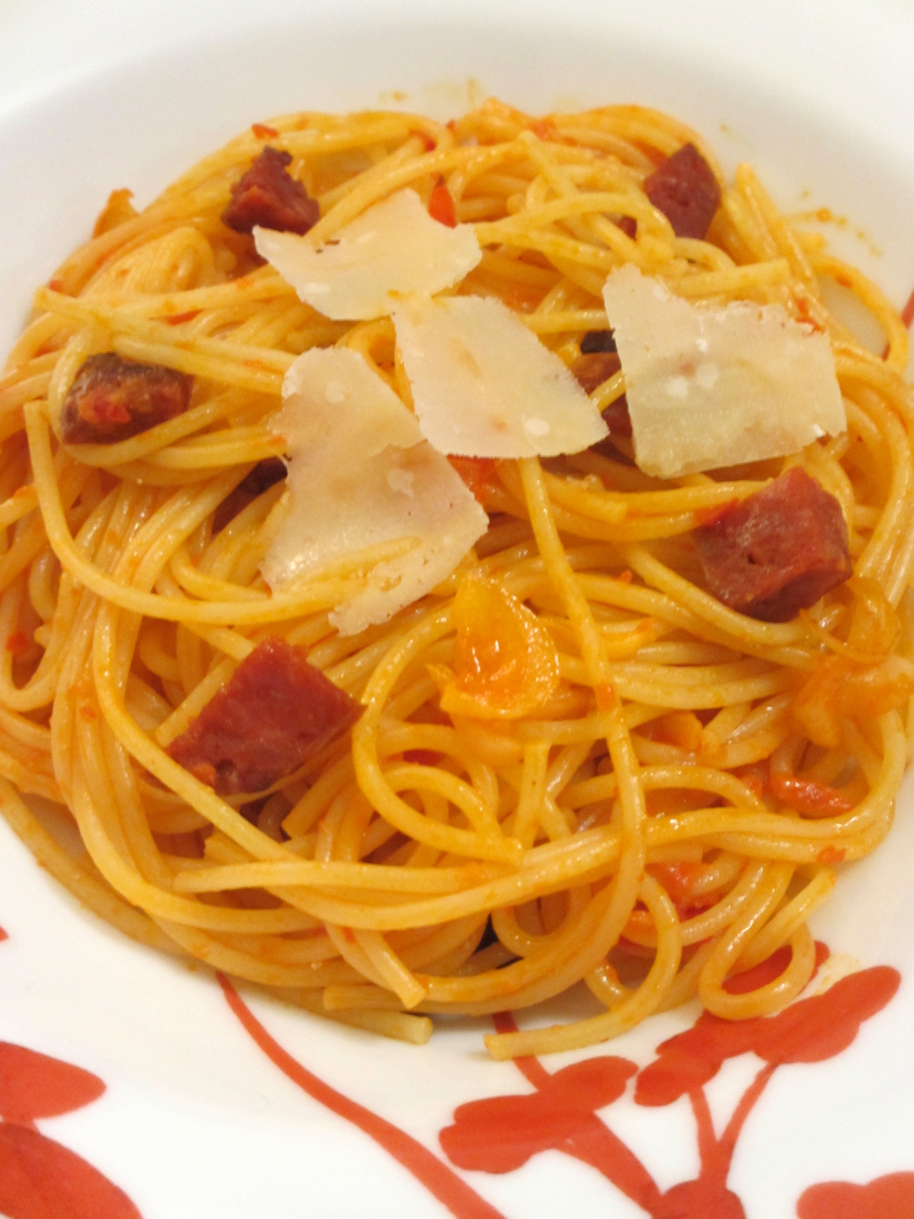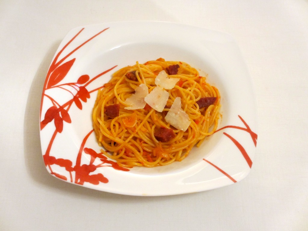 pâtes, spaghetti, pâtes rouges, crème de poivron, poivrons rouge, chorizo , plat monochrome,parmesan, italie, italien, féculents, plat complet , oignon saucier, oignon