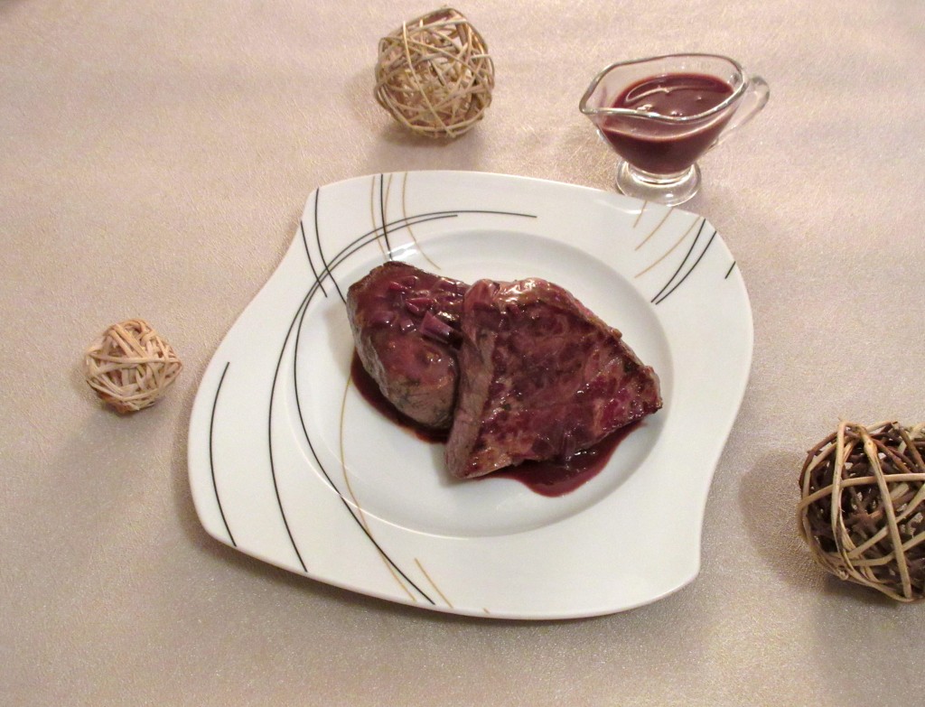 - Dresser les pavés puis arroser de sauce au chocolat et vin rouge.