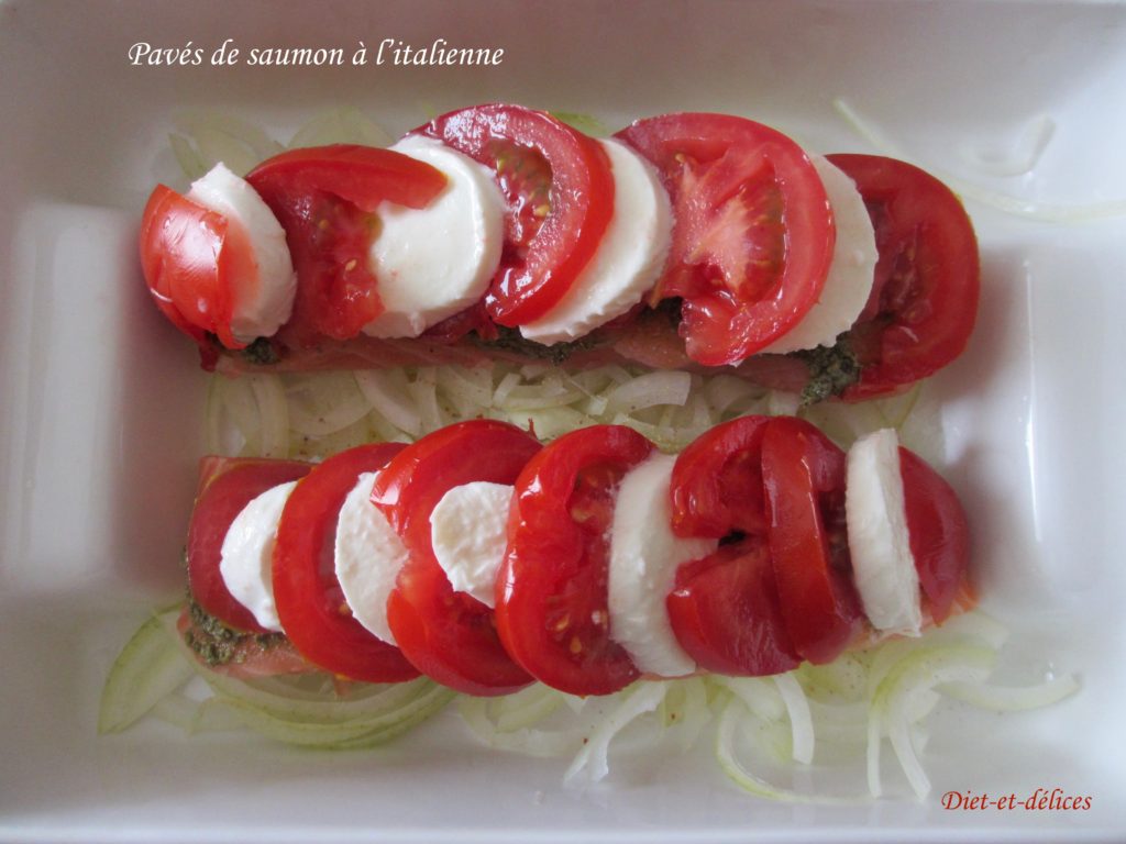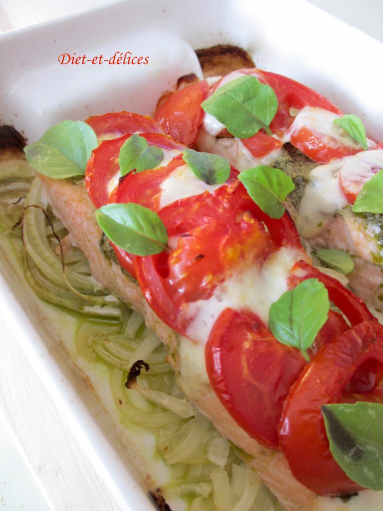 saumon, pavés de saumon, pesto, tomate, mozzarella, saumon, poisson, pesto, oignons, tomate, mozzarella, italien
