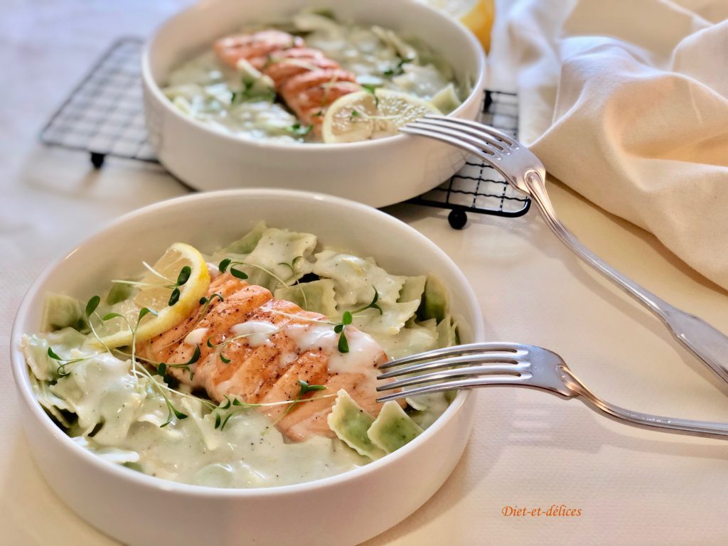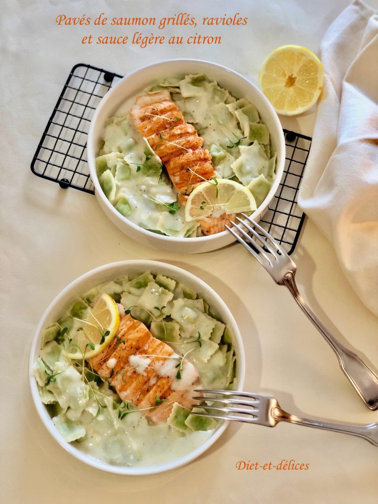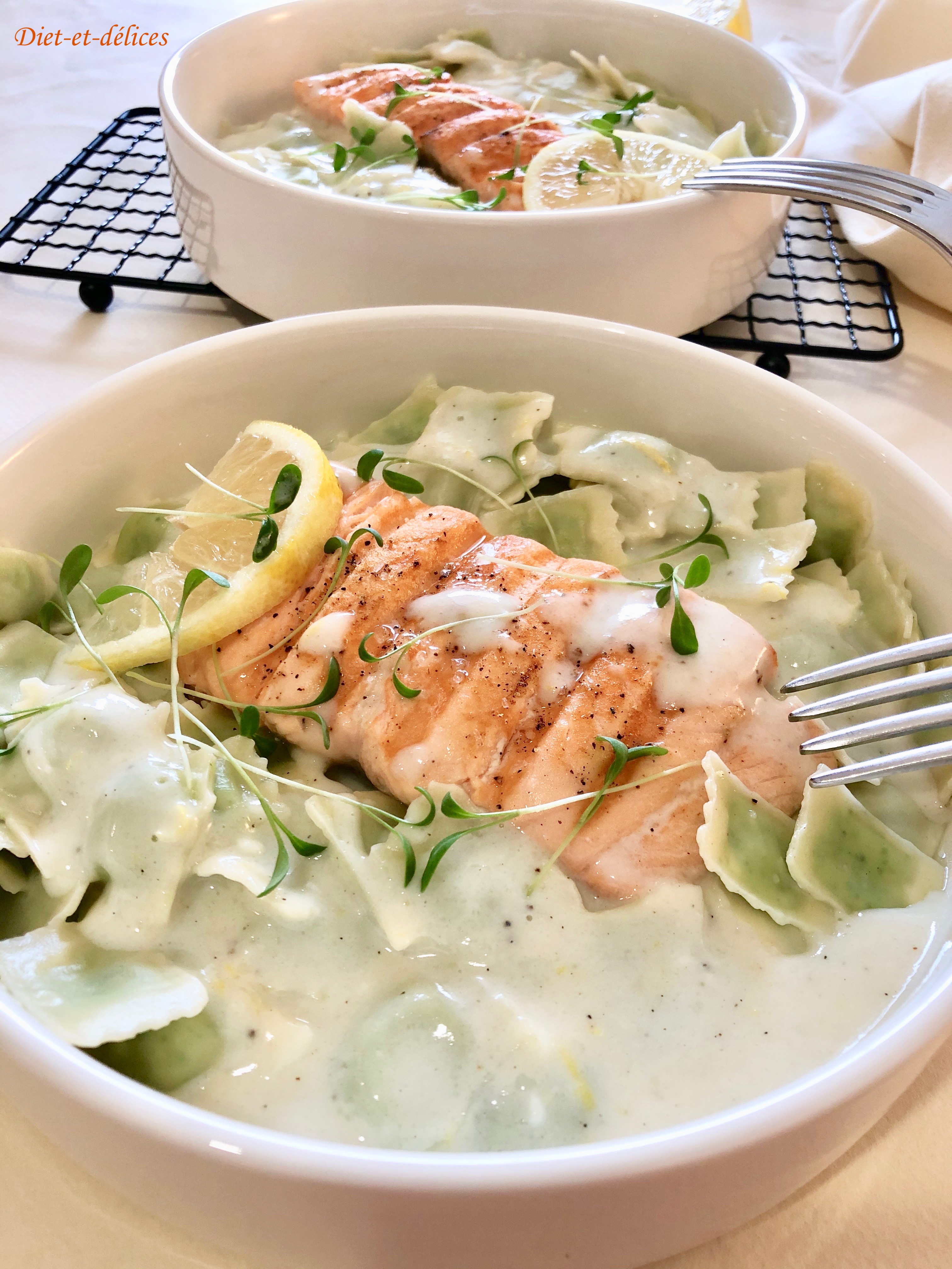 saumon, saumon grillé, ravioles, micro-pousses, cresson, sauce, sauce au citron, plat complet