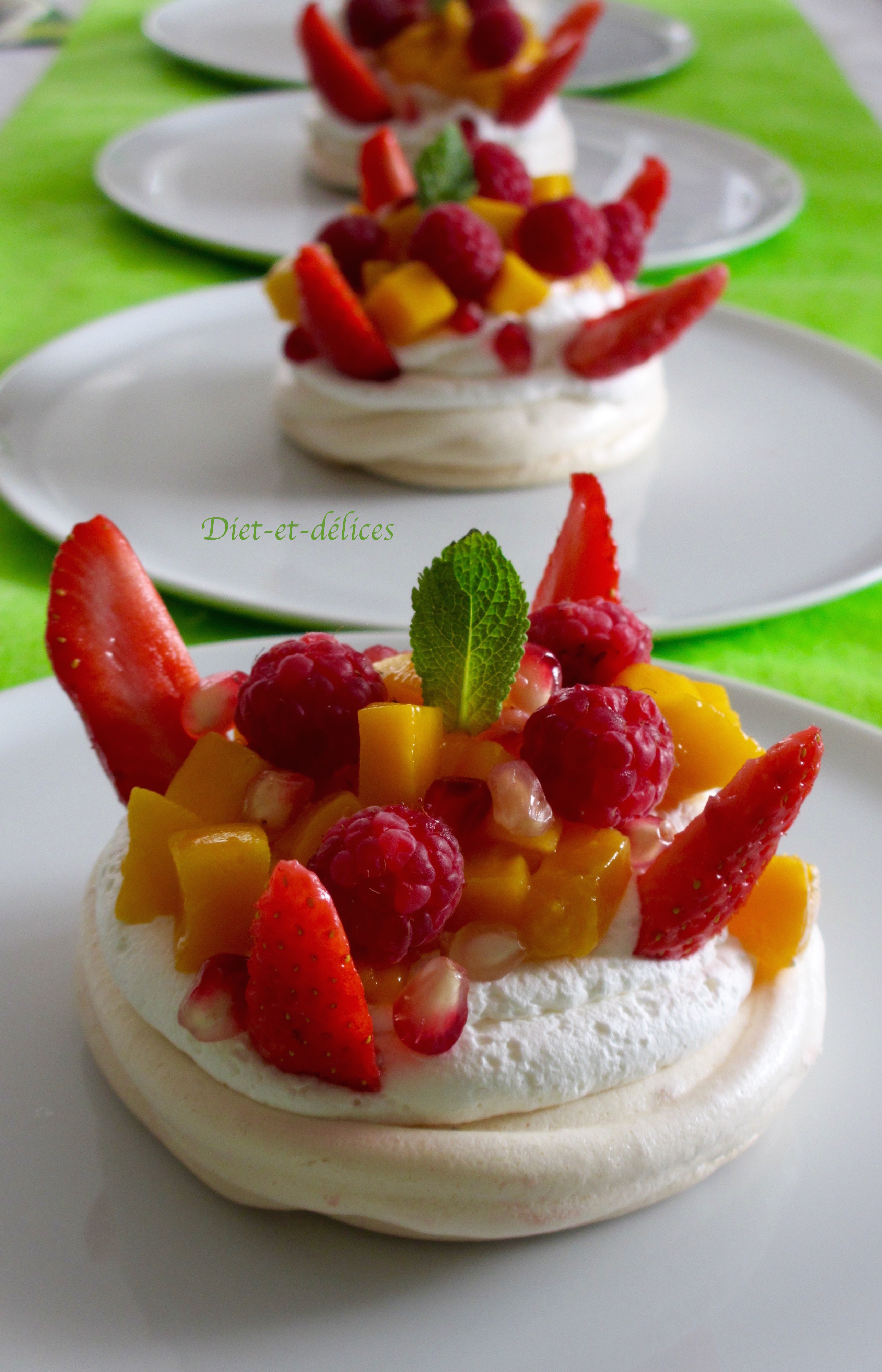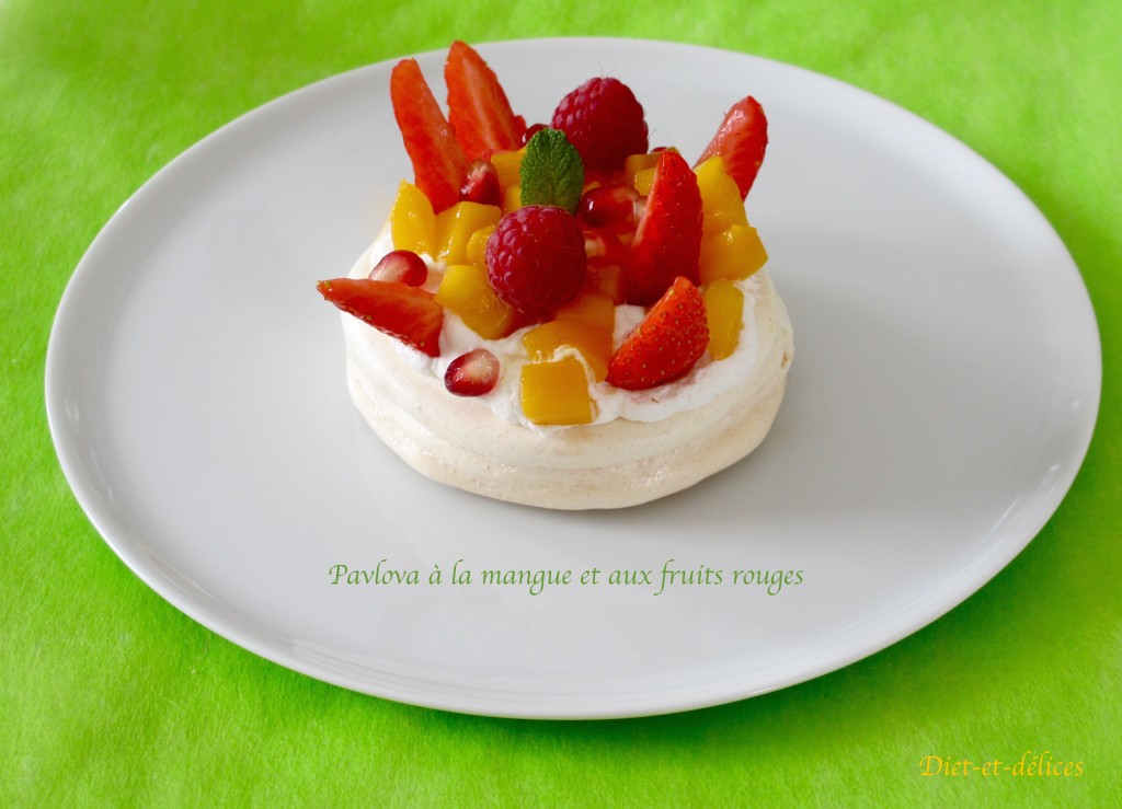 pavlova, fruits rouges, meringue, pavlova à la mangue, chantilly, fraises, pavlova à la mangue et aux fruits rouges, framboises, mangue, menthe, grenade, dessert aux fruits, végétarien, dessert individuel