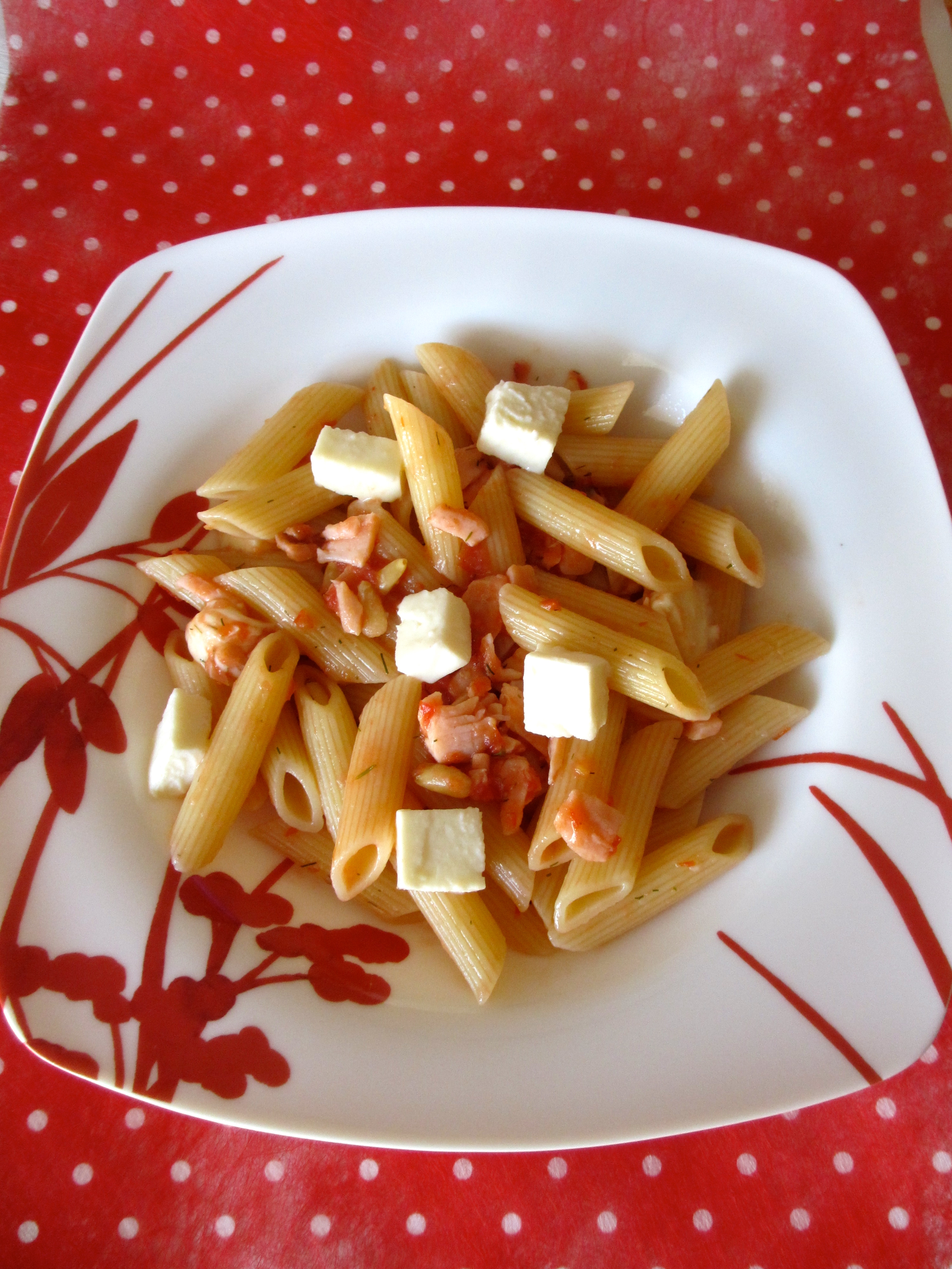 pâtes, penne, pâtes au saumon, pâtes au saumon fumé, saumon fumé, mozzarella féculents,sauce tomate, tomates, aneth, poisson, pignons de pin