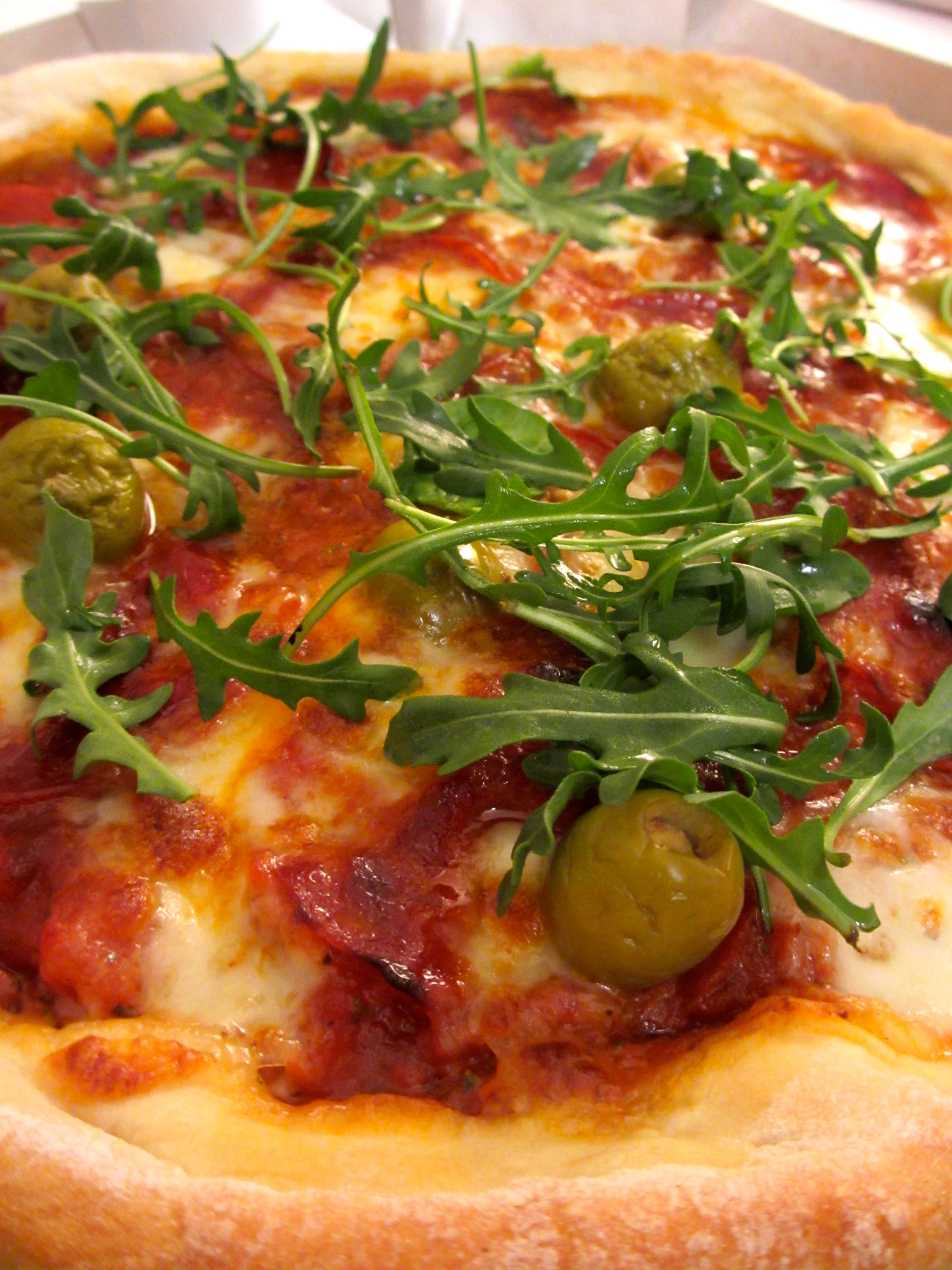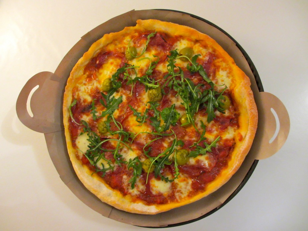 pizza, chorizo,tomates séchées, sauce tomate, mozzarella, olives, roquette, herbes de Provence, plat italien, cuisine du monde