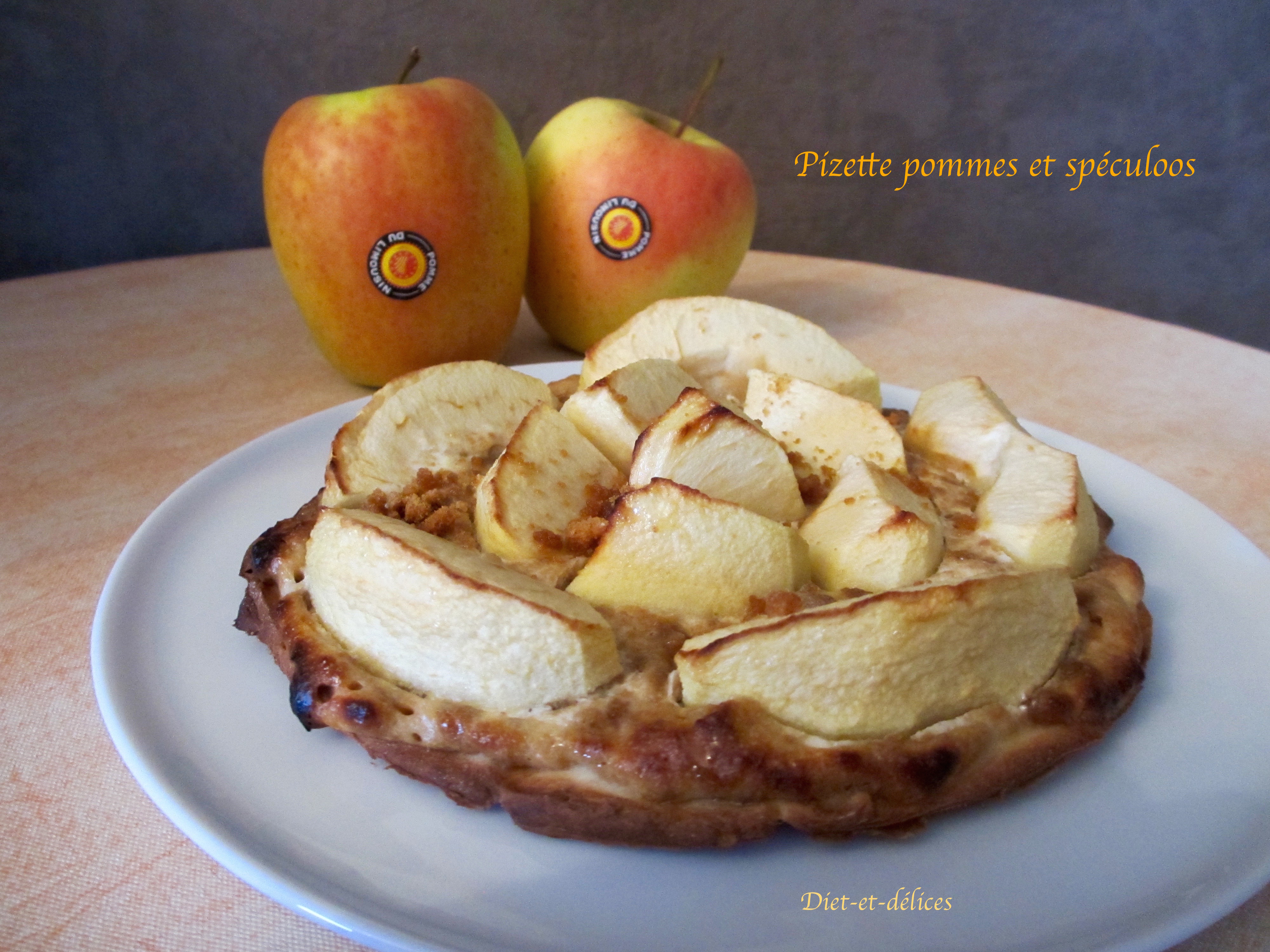 pizza, pizza sucrée, pizzette, pizza aux pommes, pommes, pizzette aux pommes, pizza aux pommes et spéculoos, spéculoos, fromage blanc, dessert, dessert aux pommes