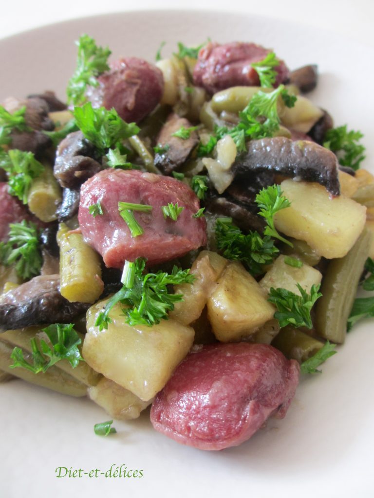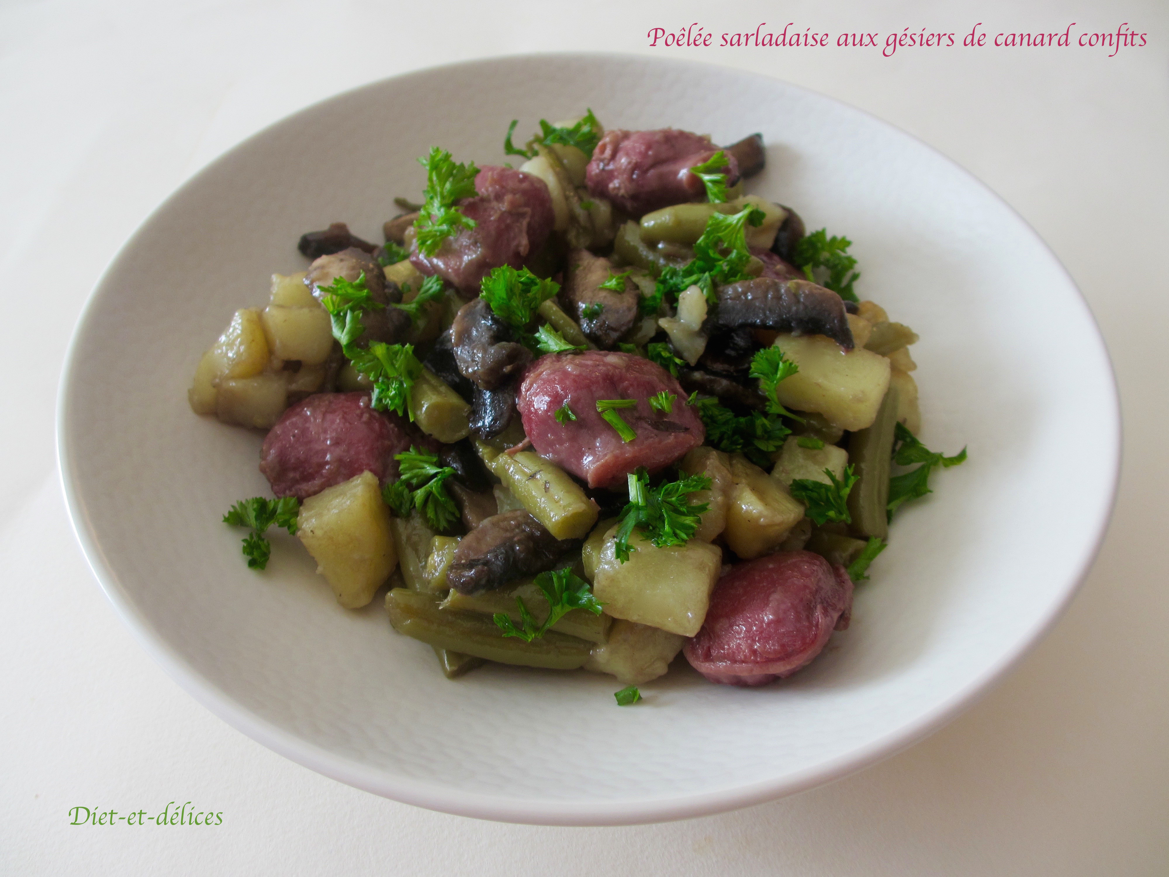 poêlée, gésiers, haricots verts, poêlée sarladaise, gésiers de canard, pommes de terre, plat complet, gésiers de canard confits, champignons