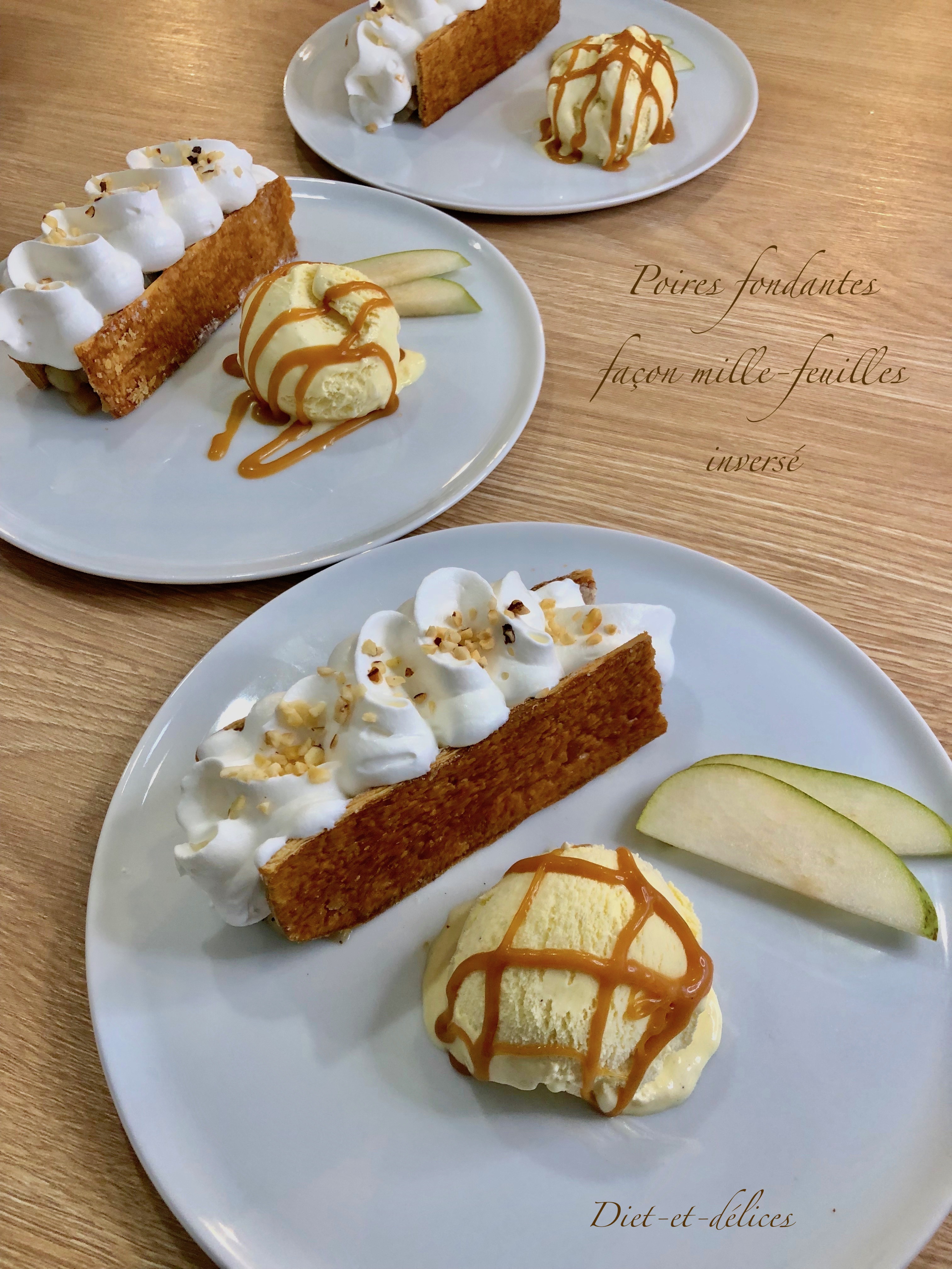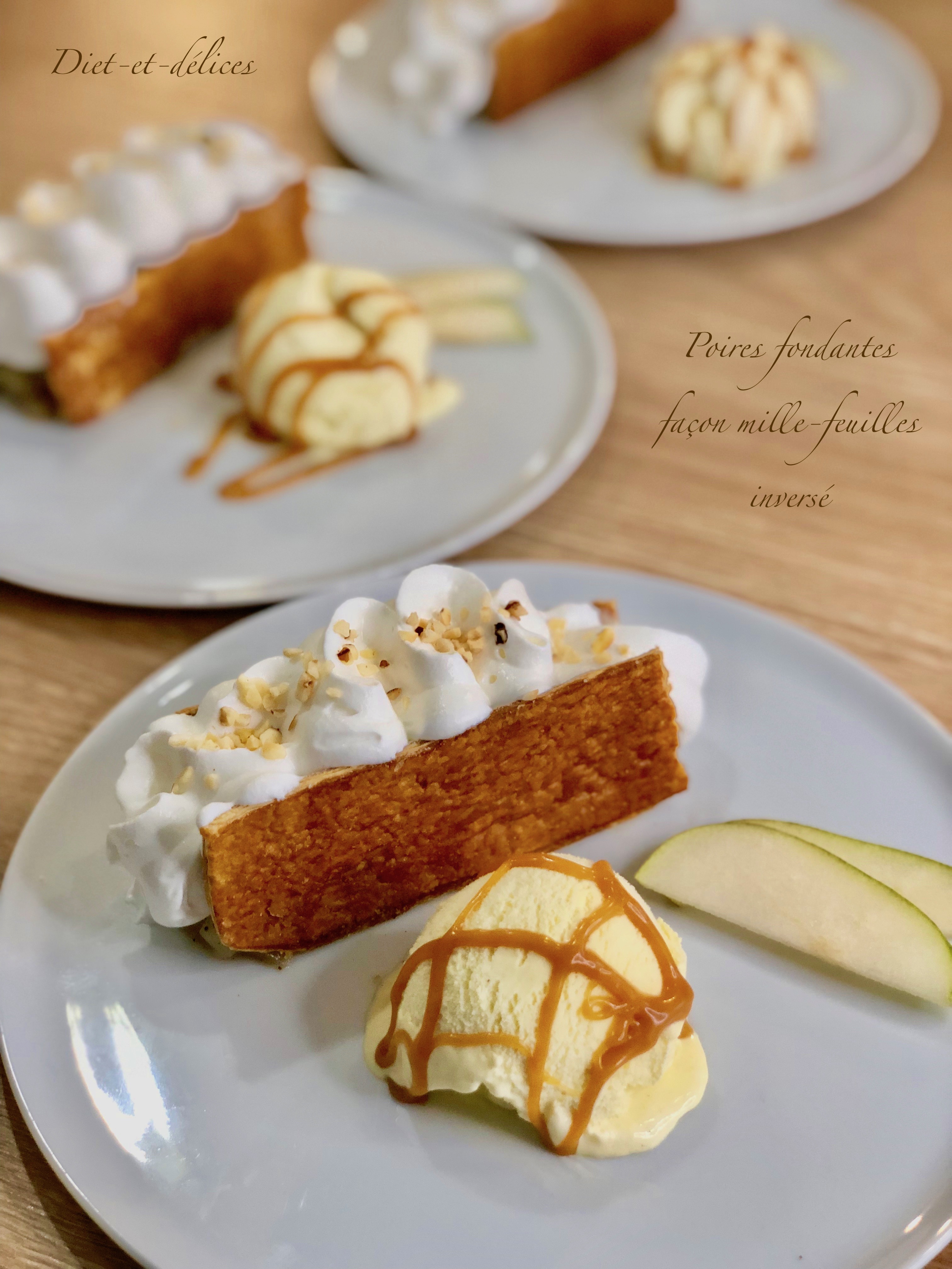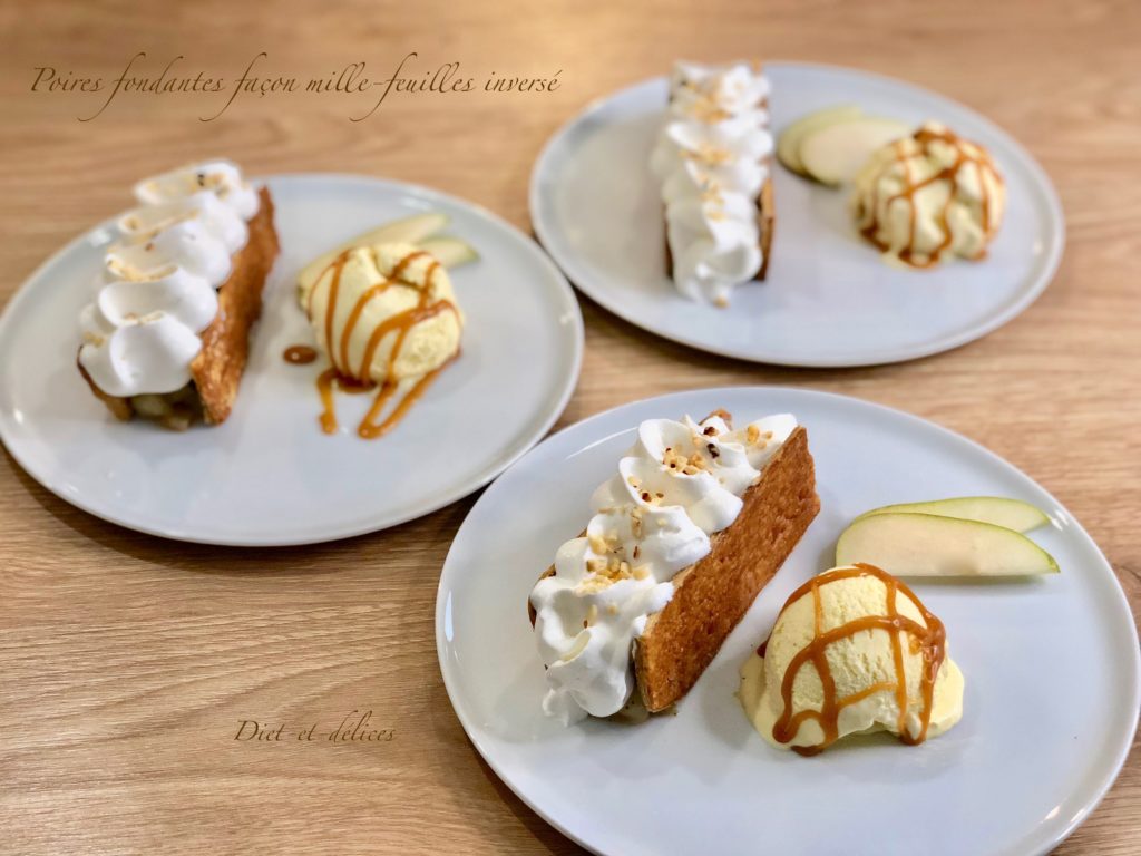 dessert, mille-feuilles, poires, dessert à l’assiette, pâte feuilletée caramélisée, vanille