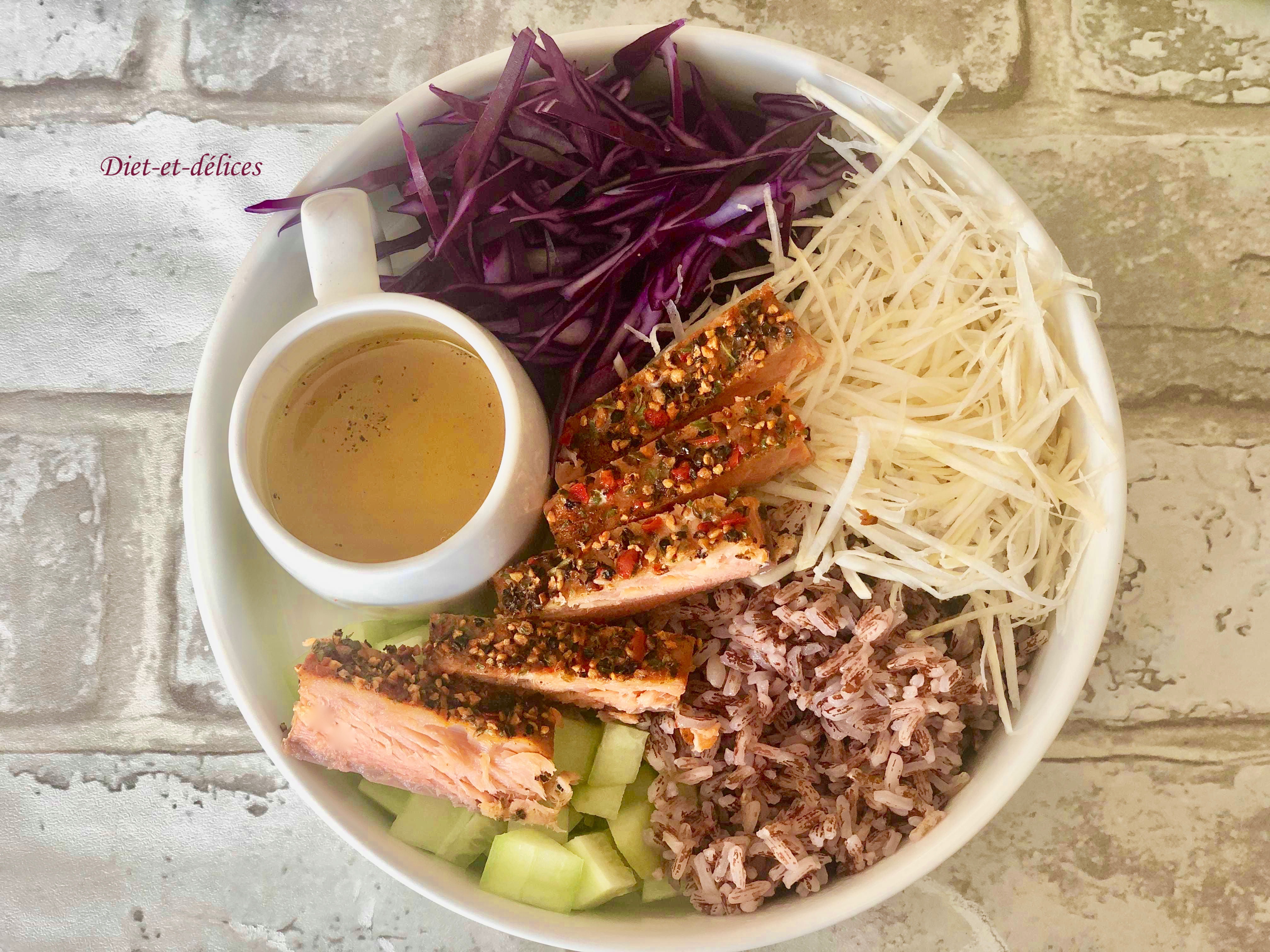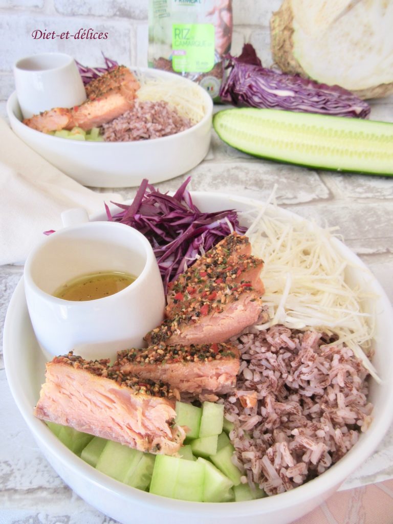 poke bowl, saumon, saumon mi-cuit, riz rose, concombre, chou rouge, crudités, céleri rave, diététique
