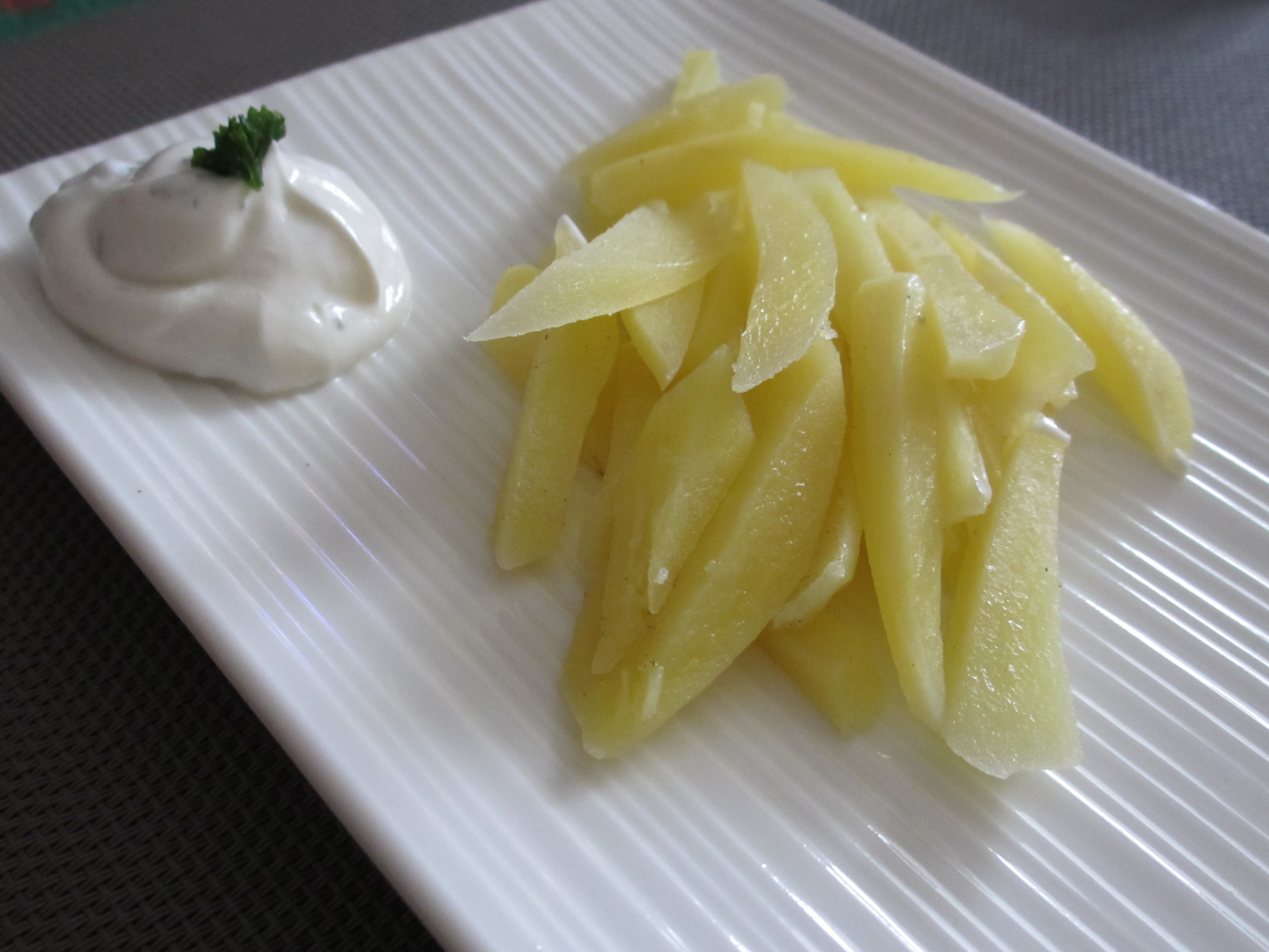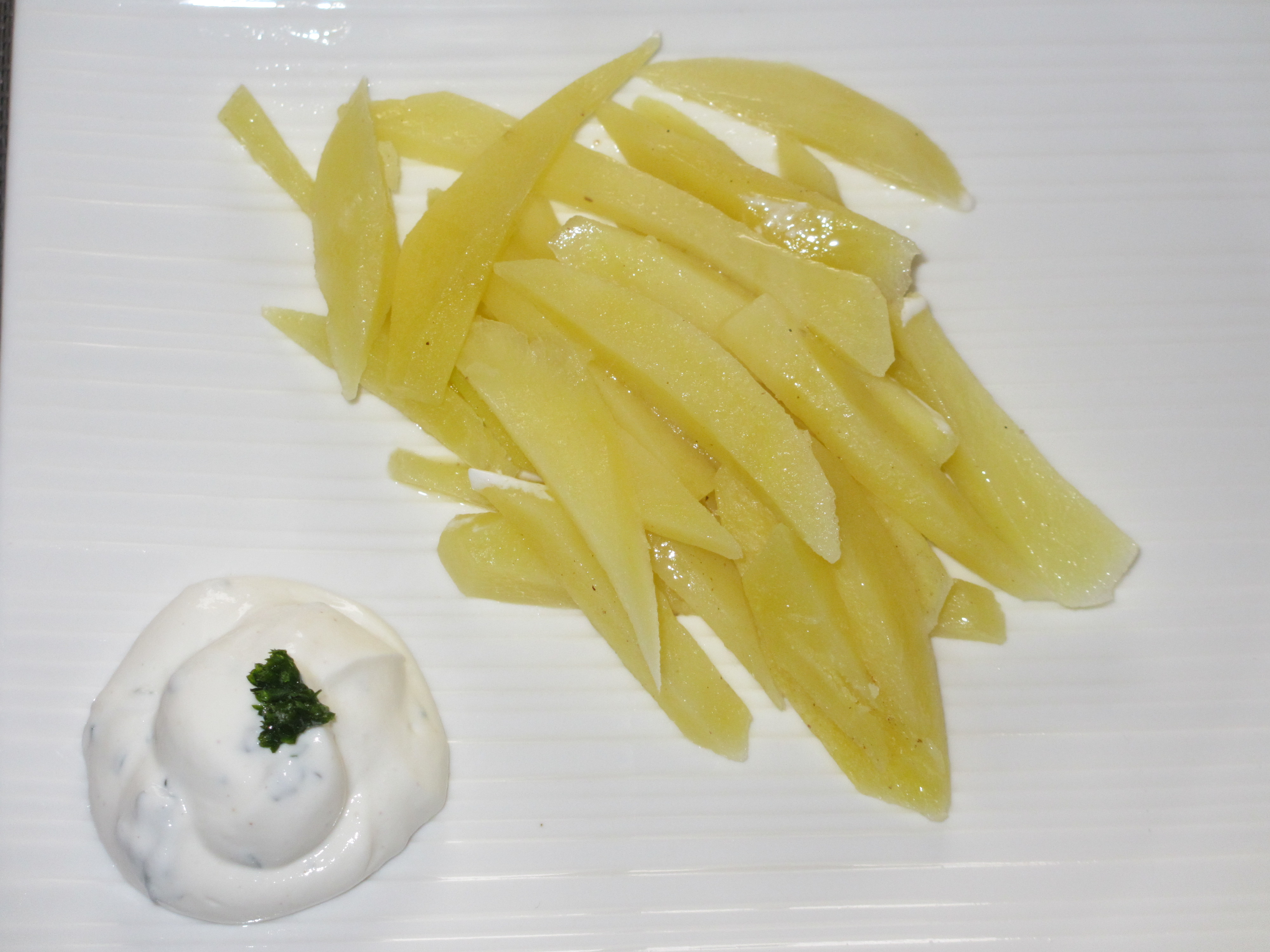 - Eplucher les pommes de terre et les couper en frites. Les rincer.