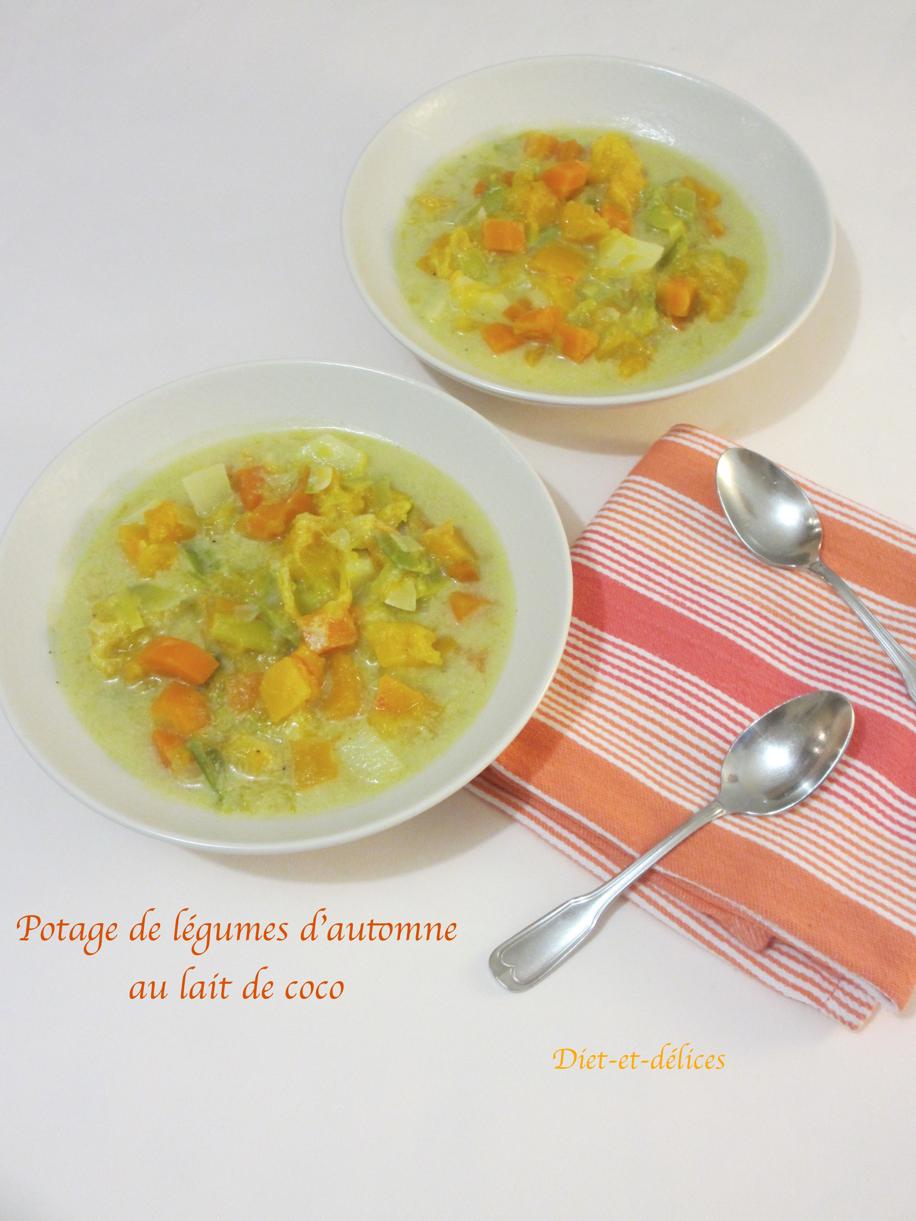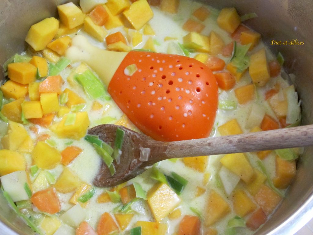 potage, soupe, pommes de terre, potage de légumes, soupe de légumes, potiron, citrouille, carottes, poireaux, lait de coco, combava
