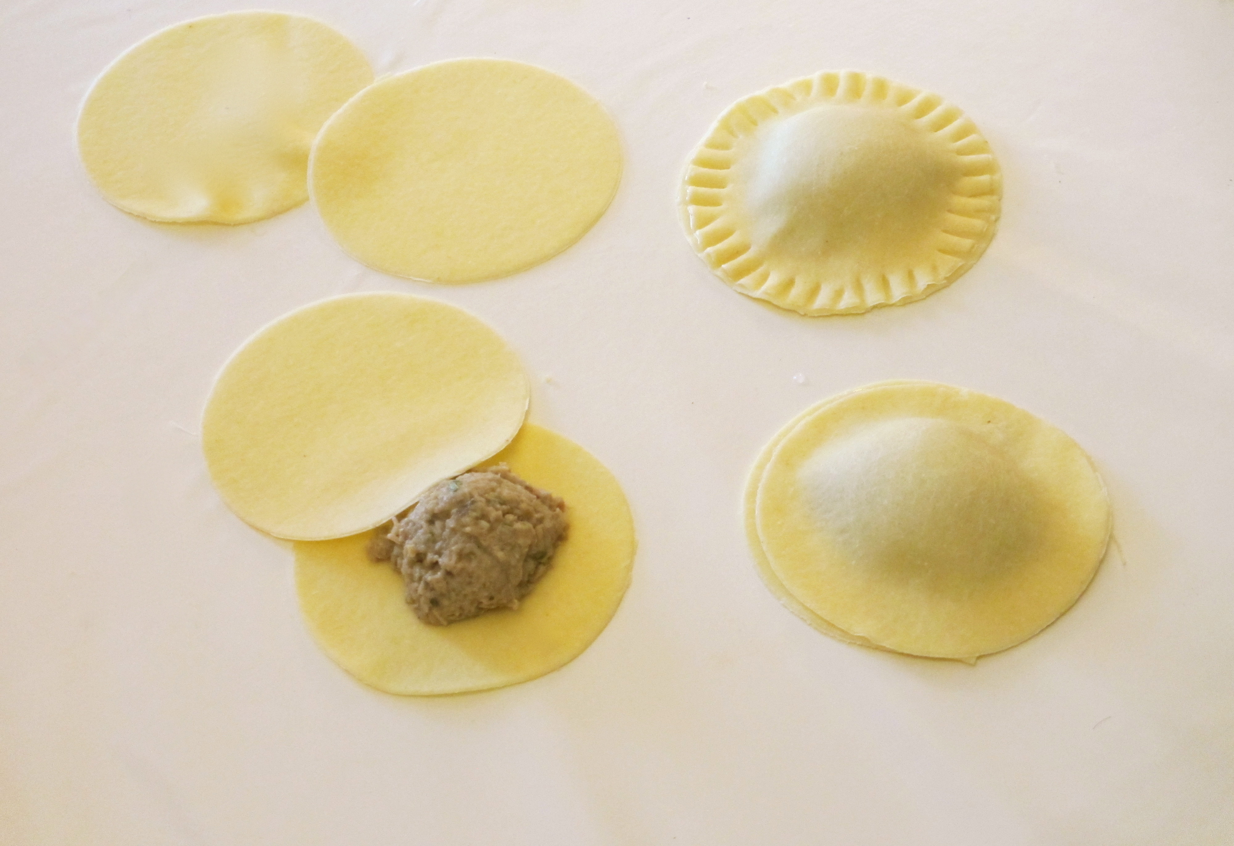 - Disposer une cuillère à café bombée de farce par rond de pâte.