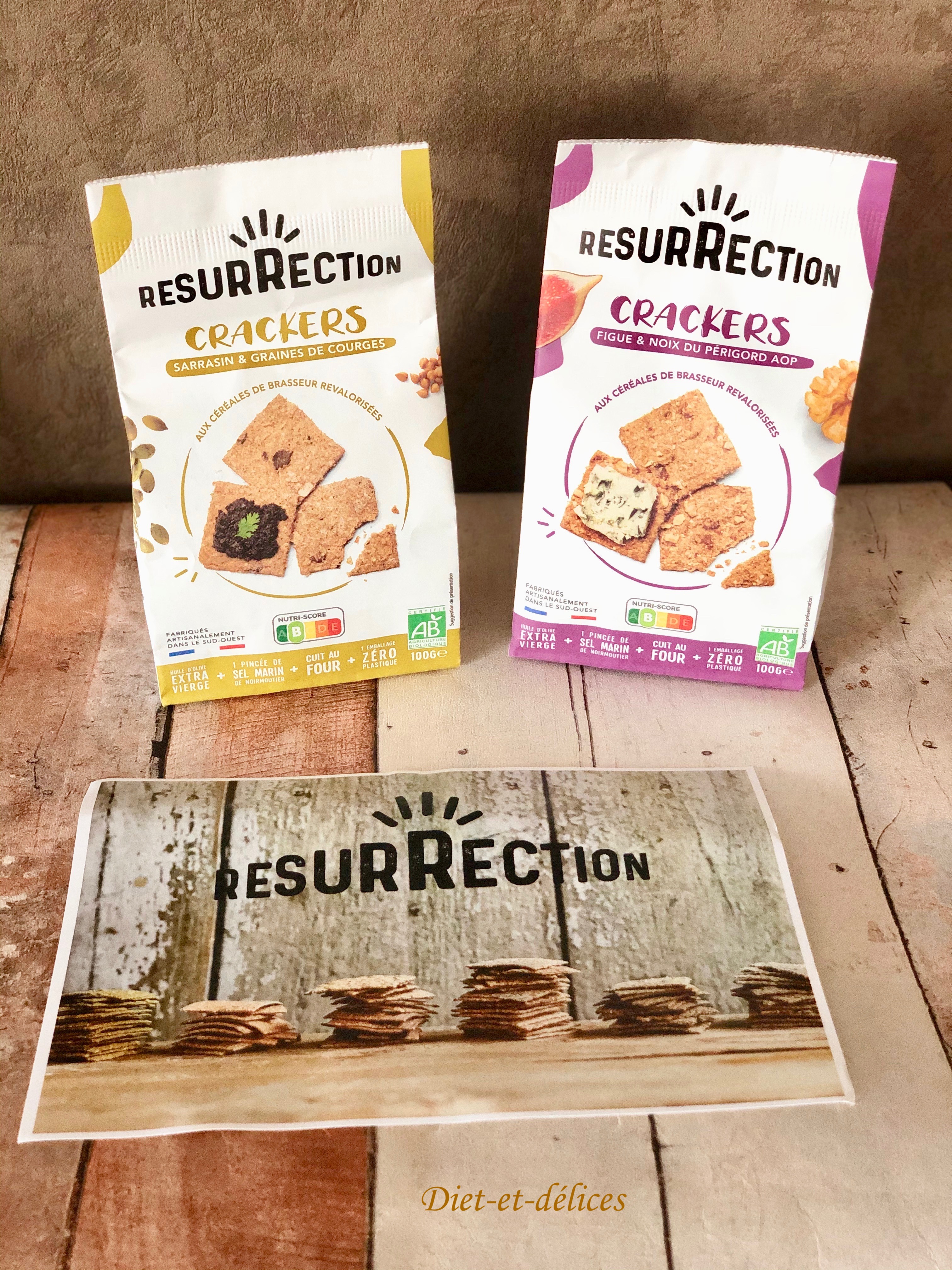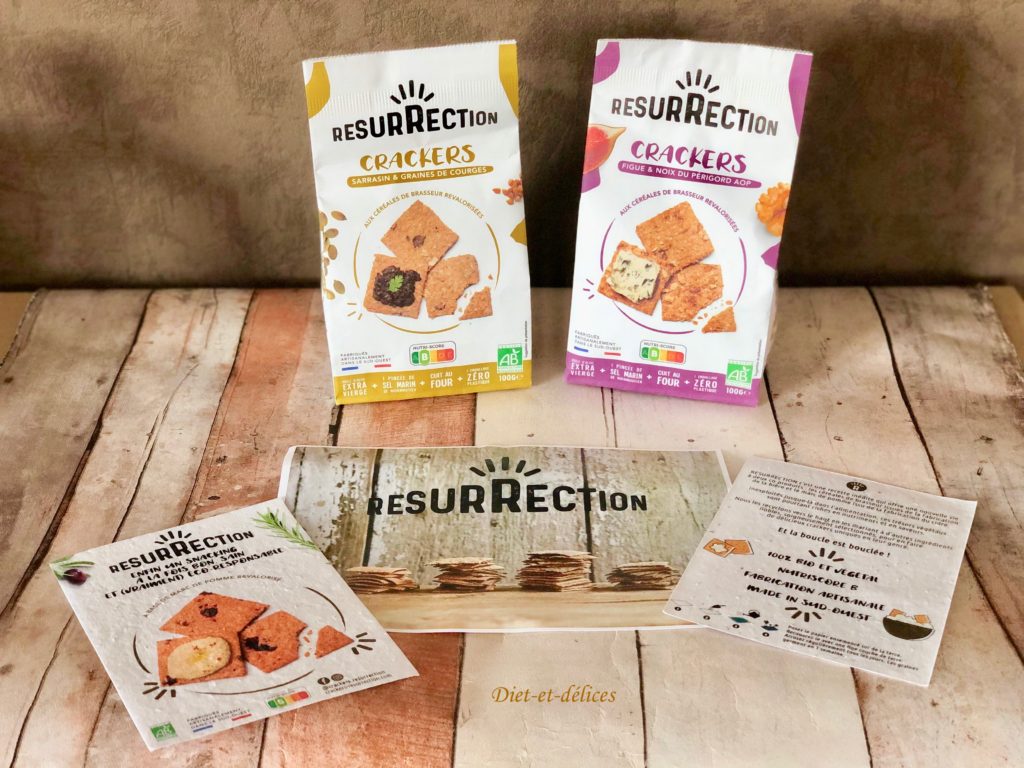 Ressurection propose des crackers grâce à l’upcycling alimentaire. En effet, ces crackers sont élaborés à partir des drêches, les céréales d’orge malté ayant servies à la fabrication de la bière. Ces céréales, tout juste sorties de la cuve du brasseur, qui sentent bon la tartine grillée, étaient jusqu’ici un trésor inexploité. 3kg de drêches sont transformés et revalorisés en 9kg de crackers. Avec Ressurection, elles sont mariées à d’autres ingrédients nobles, soigneusement sélectionnés pour en faire de délicieux crackers sains et vertueux. Des crackers à base de marc de pomme issu de la fabrication du cidre sont également disponibles. Le marc de pomme est riche en nutriment et en fibres et son goût est acidulé.
